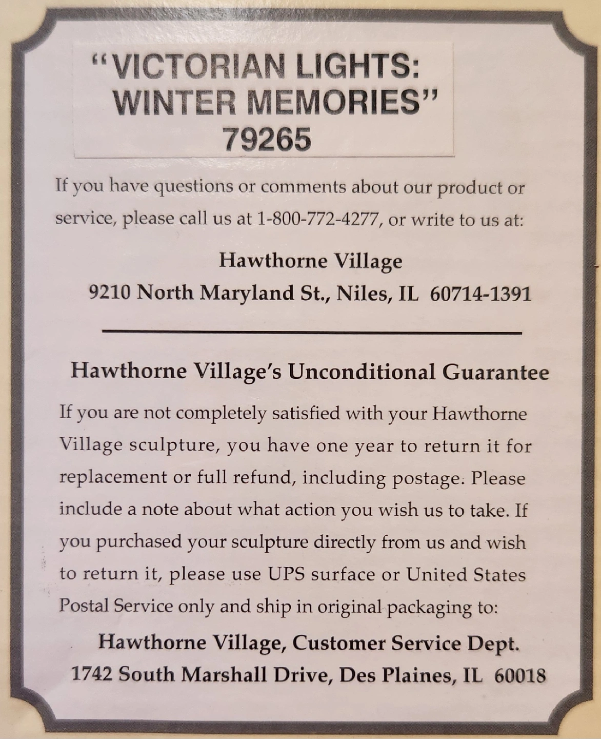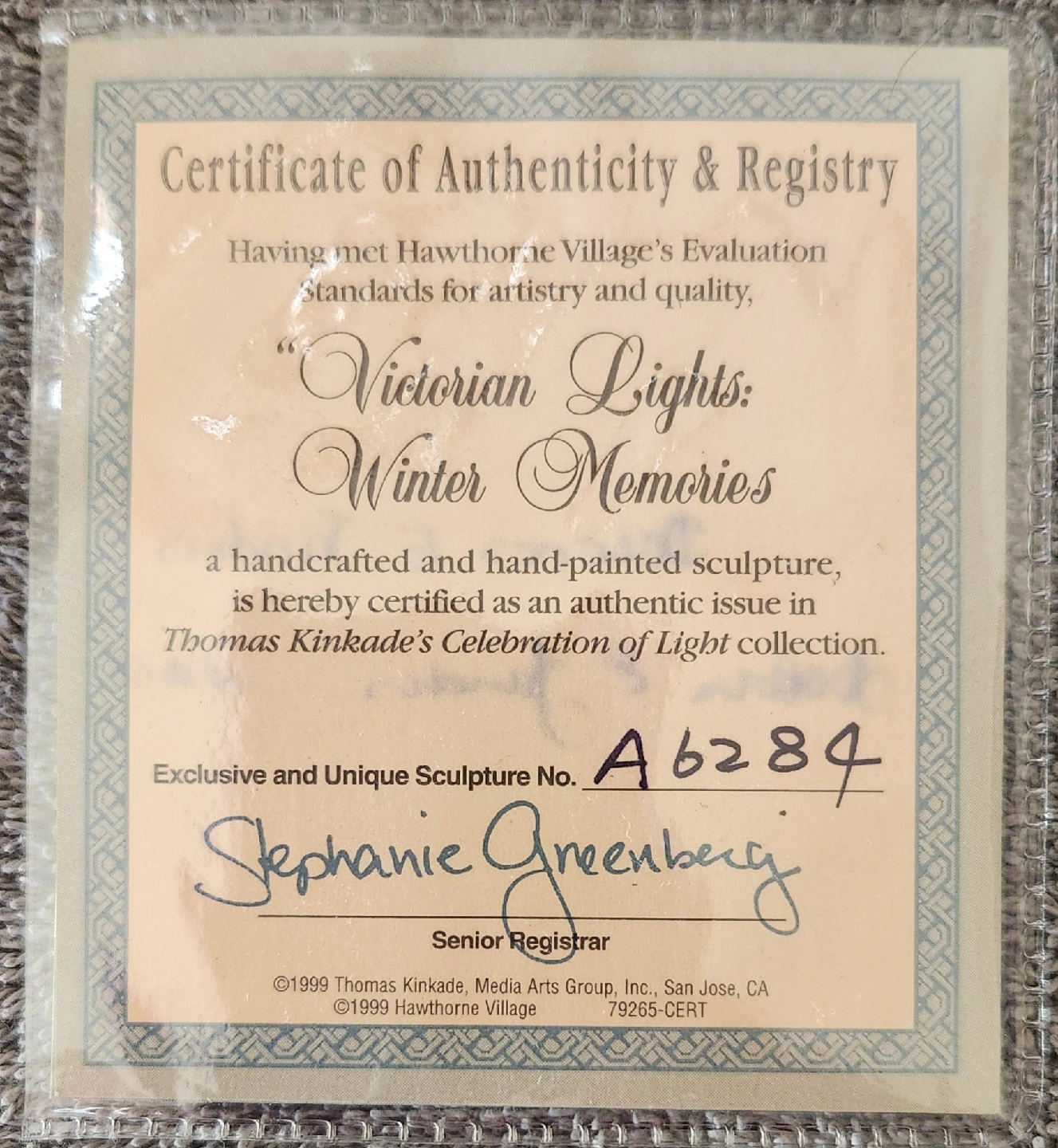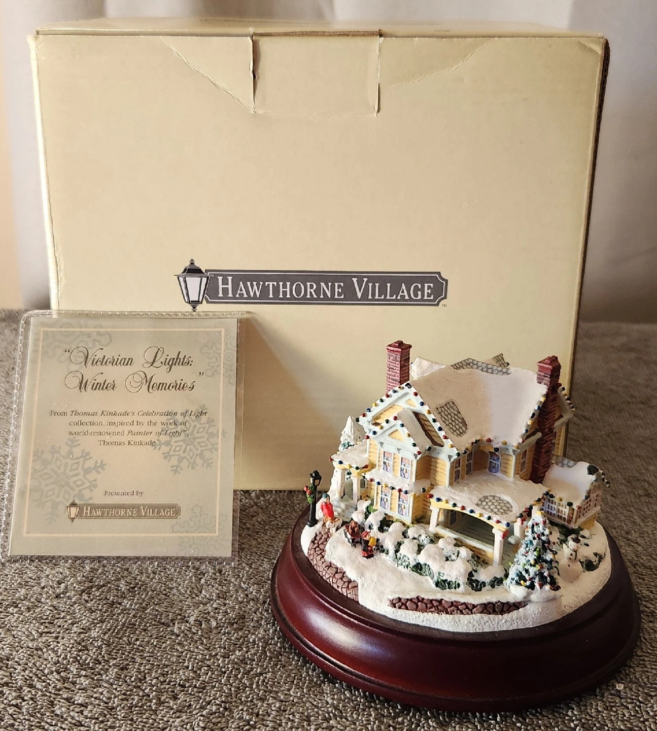 Selling a Hawthorne Village "Victorian Lights: Winter Memories" sculpture from the Thomas Kinkade's Celebration of Light collection. It's a handcrafted and hand-painted piece, and it comes with its original box and a certificate of authenticity. Lights up with 2 AA batteries.
