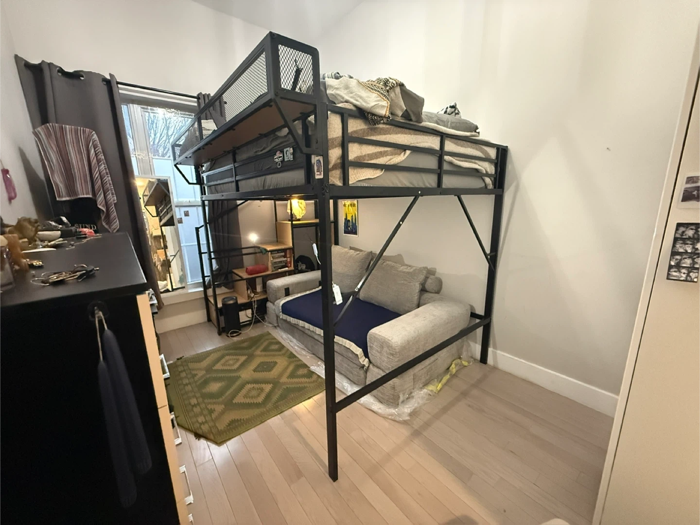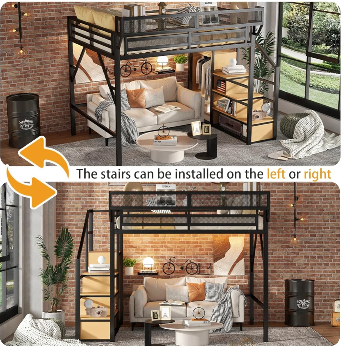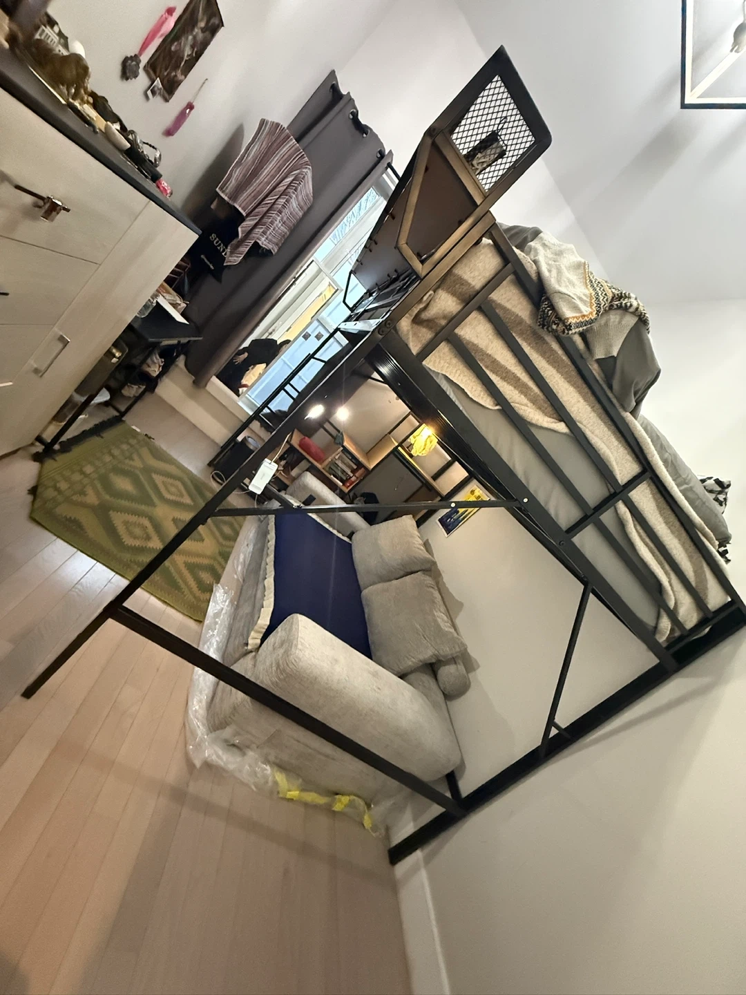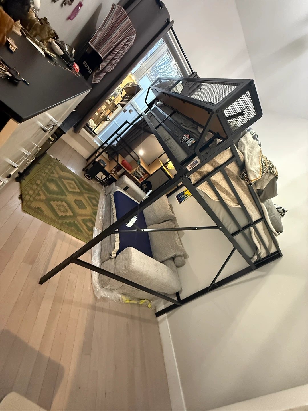 Spacious black metal loft bed frame. Has sturdy construction. Creates a big open area underneath, perfect for a couch, desk, or extra storage. Mattress not included.