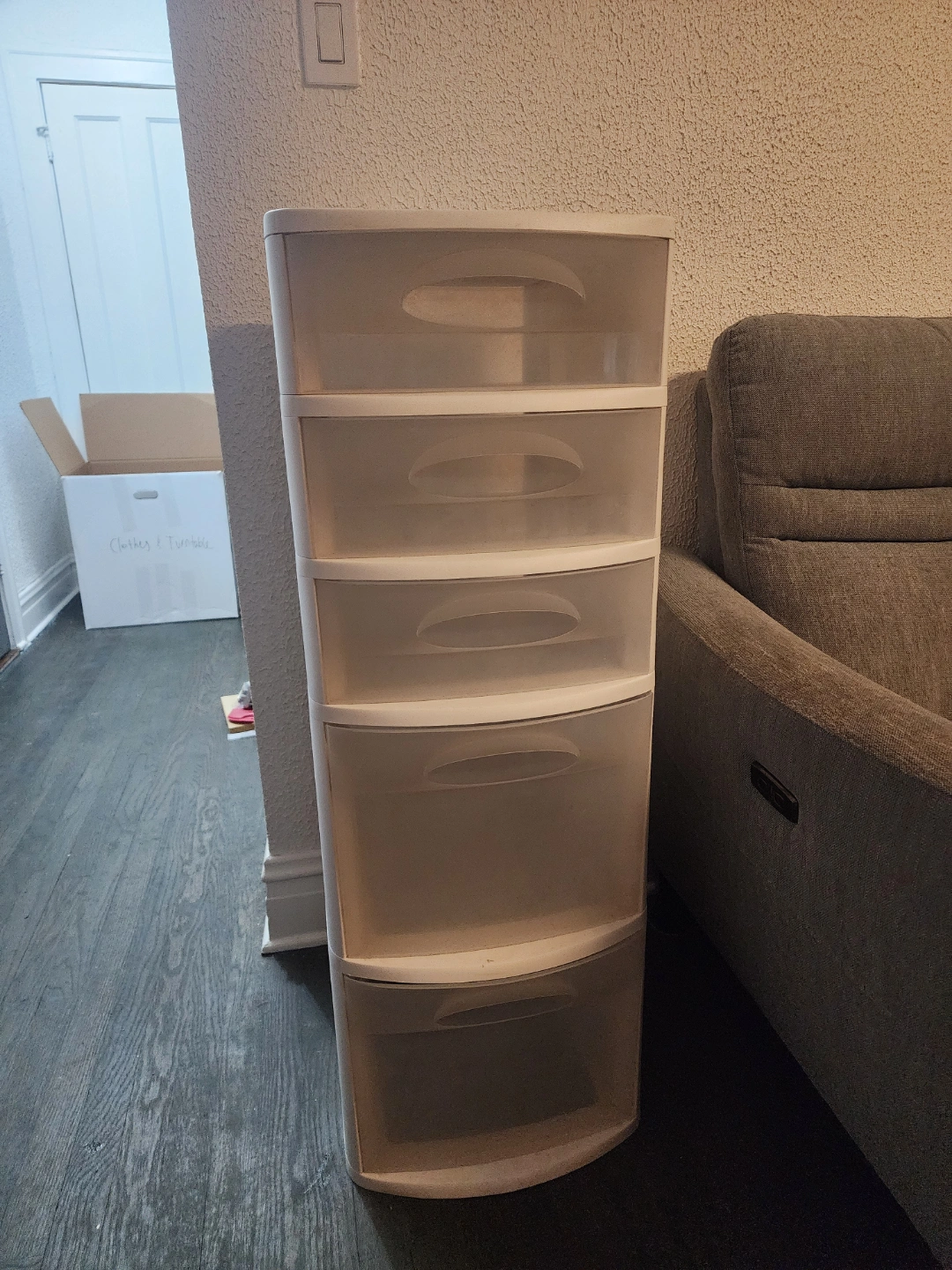 Five-drawer plastic storage unit. Great for organizing smaller items. Once held a truly impressive amount of art supplies, but is no longer needed. Curved design. A bit dusty, but no scratches or other damage.