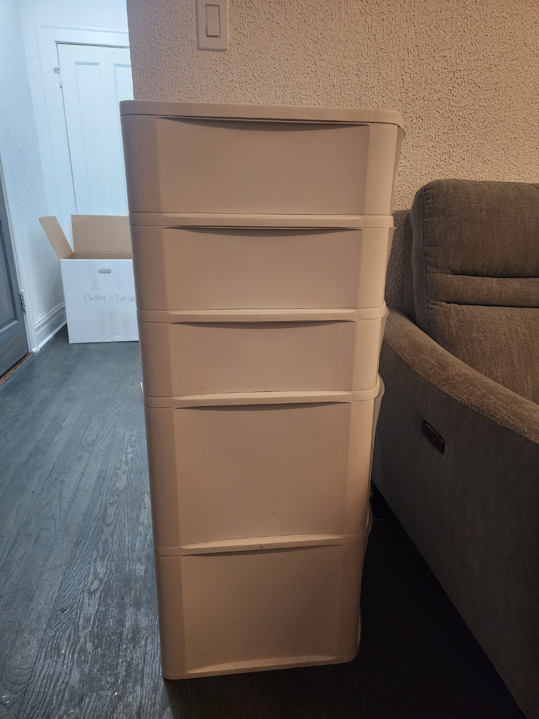 Five-drawer plastic storage unit. Great for organizing smaller items. Once held a truly impressive amount of art supplies, but is no longer needed. Curved design. A bit dusty, but no scratches or other damage.