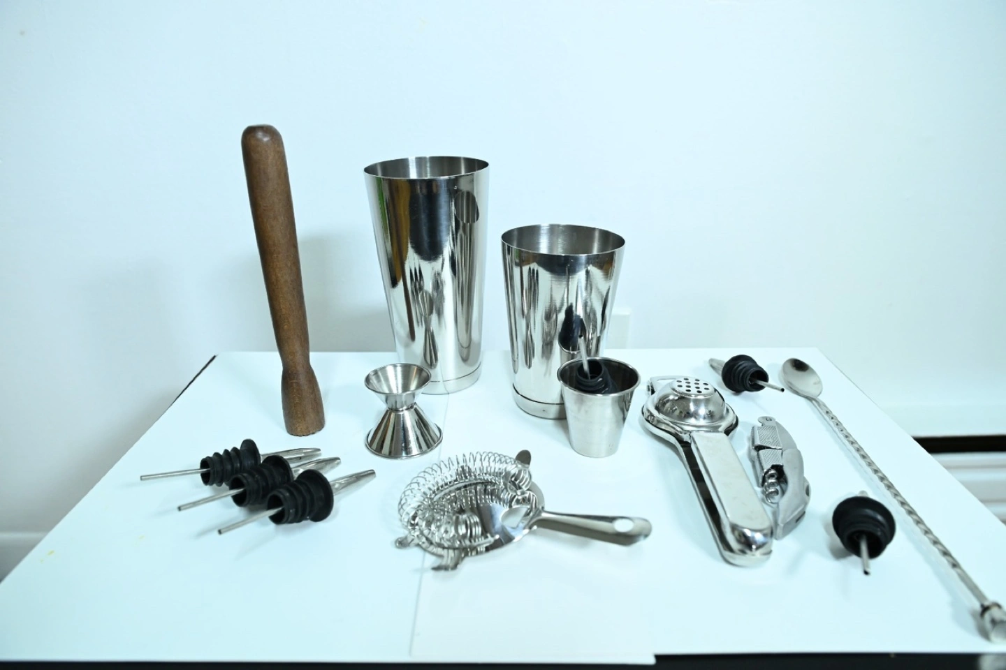 Get ready to shake up some fun with this 16-piece cocktail shaker bar set! It includes everything you need to become a master mixologist. You'll get stainless steel rubber pourers, a double jigger, shot glasses, a muddler, a Hawthorne strainer, a bottle opener, a citrus squeezer, a bar spoon, and a cobbler shaker with a strainer cover. It also comes with a book of 35 cocktail recipes!