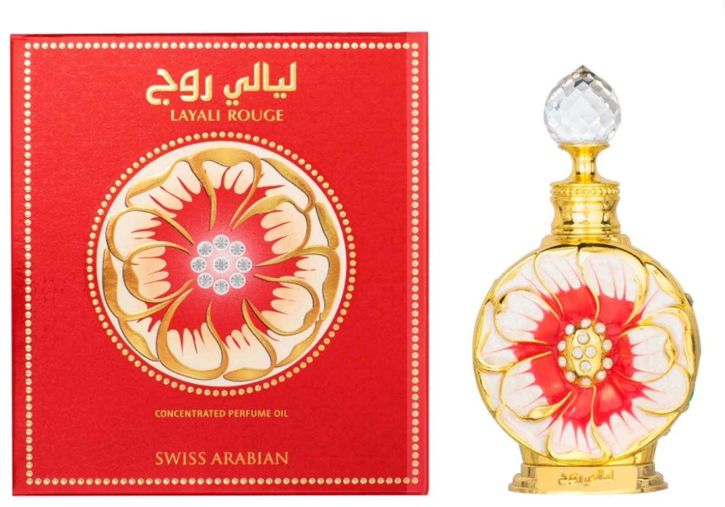 Selling a bottle of Layali Rouge Concentrated Perfume Oil by Swiss Arabian. This perfume comes in a beautiful bottle with a red and gold design. It is a concentrated perfume oil from Swiss Arabian.