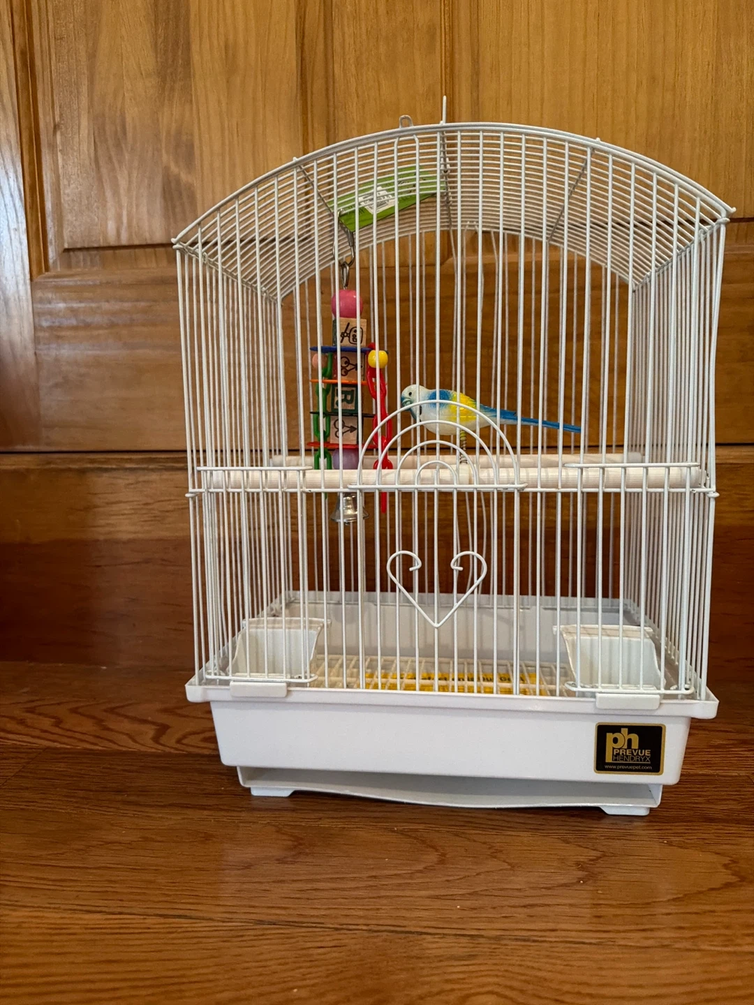 This white bird cage is ideal for small birds. It includes a perch and a toy with colorful beads. The base is a white plastic tray with a heart design on the front.