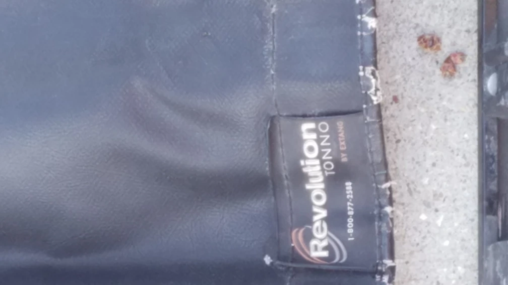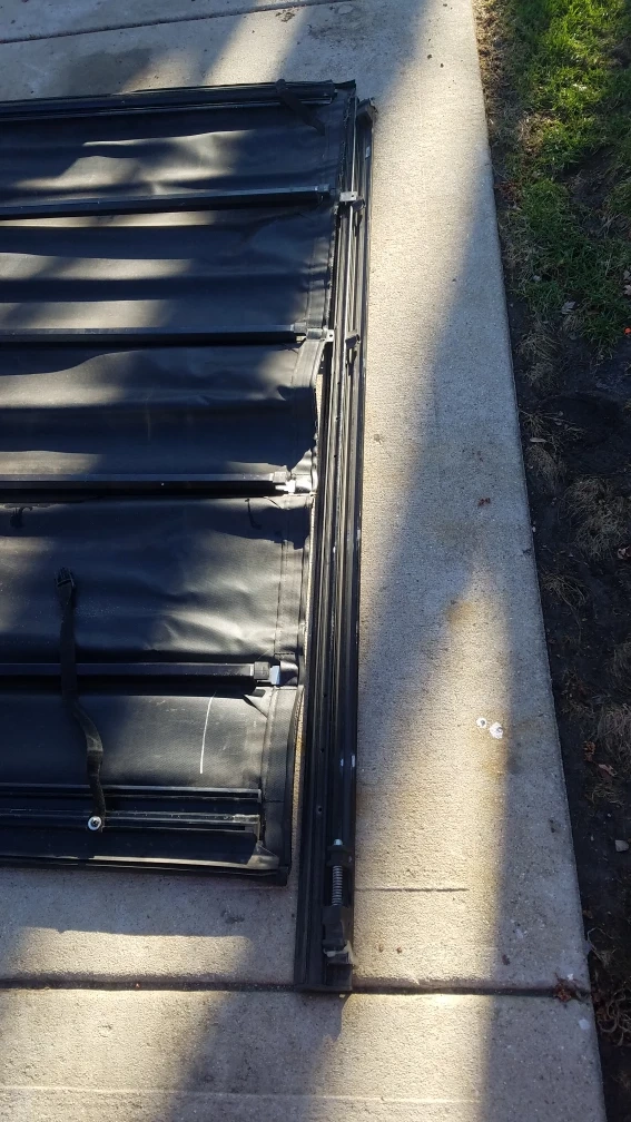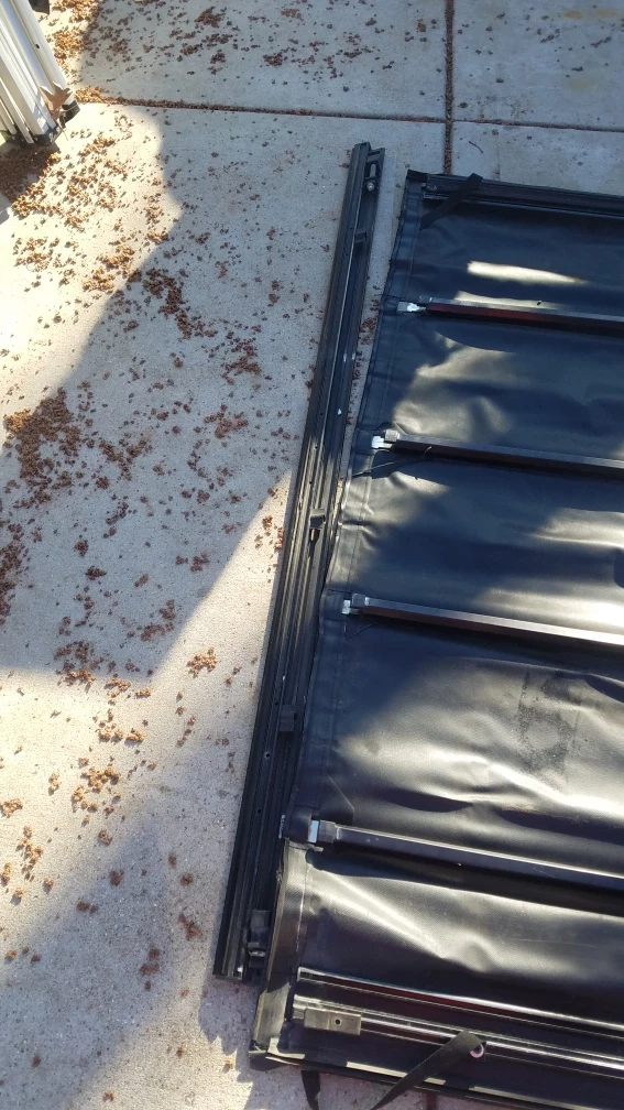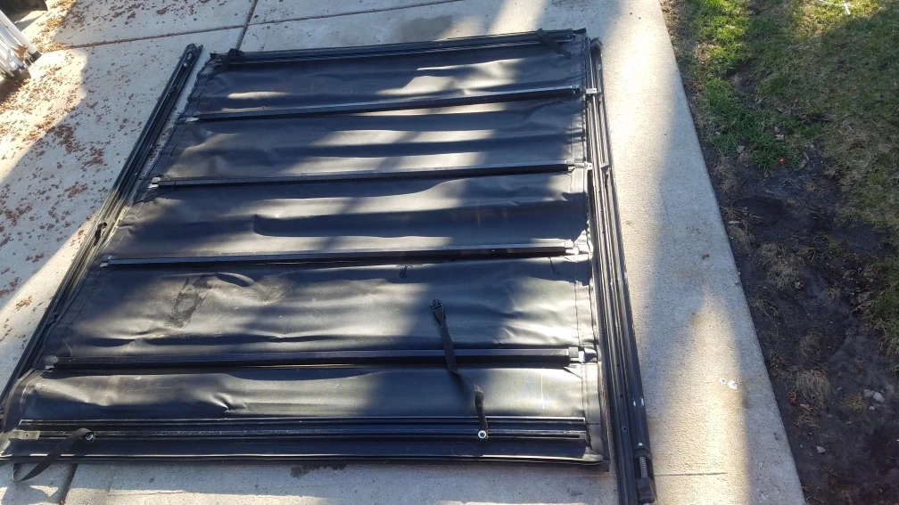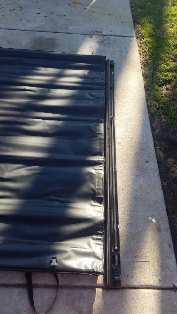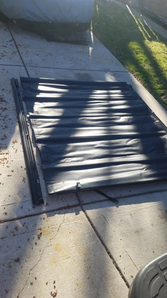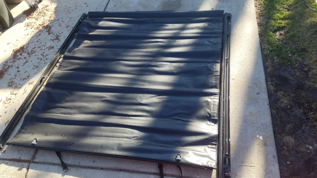 This is an Extang Revolution Tonneau cover. It's made from black vinyl material. The cover includes straps to secure it when rolled up. 77"L 64"w