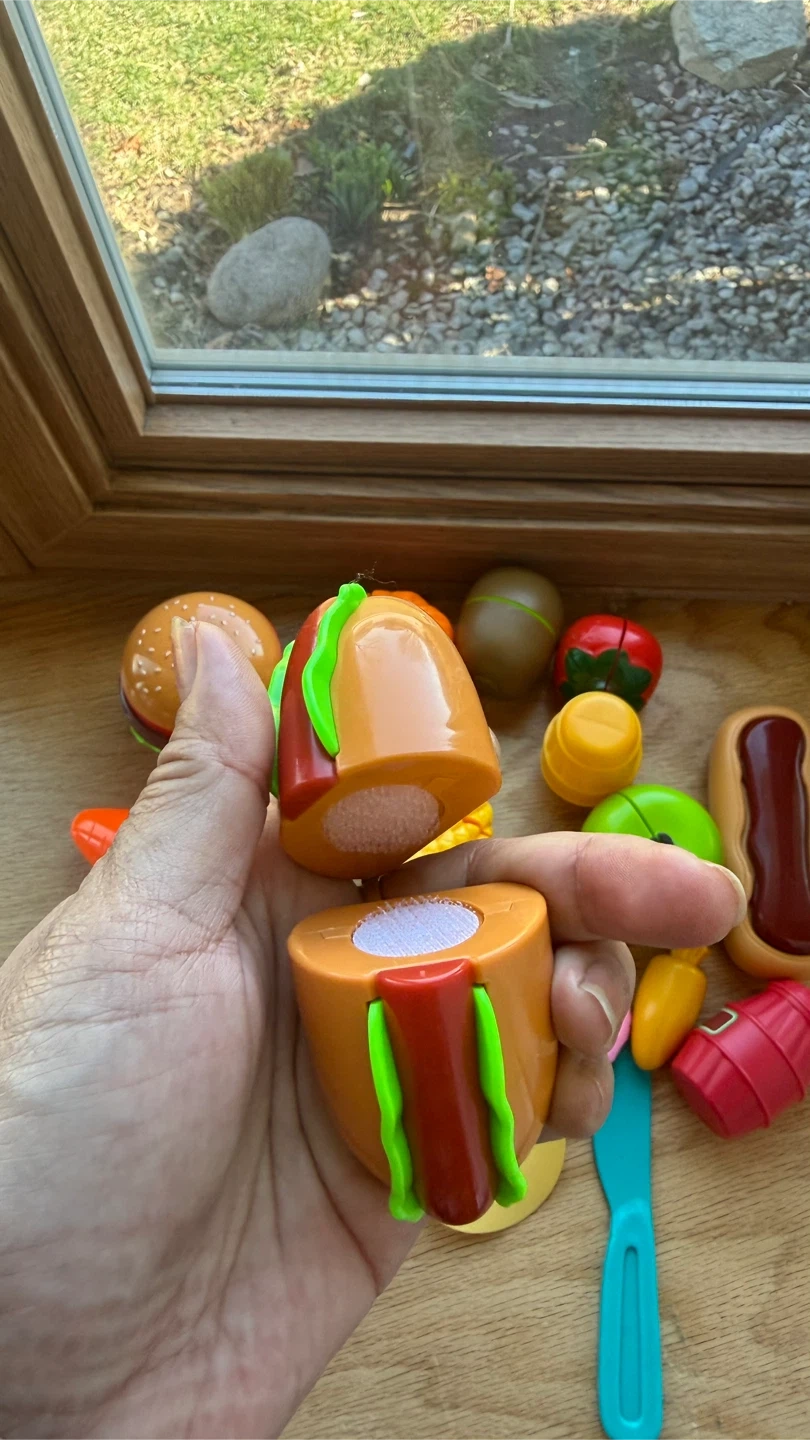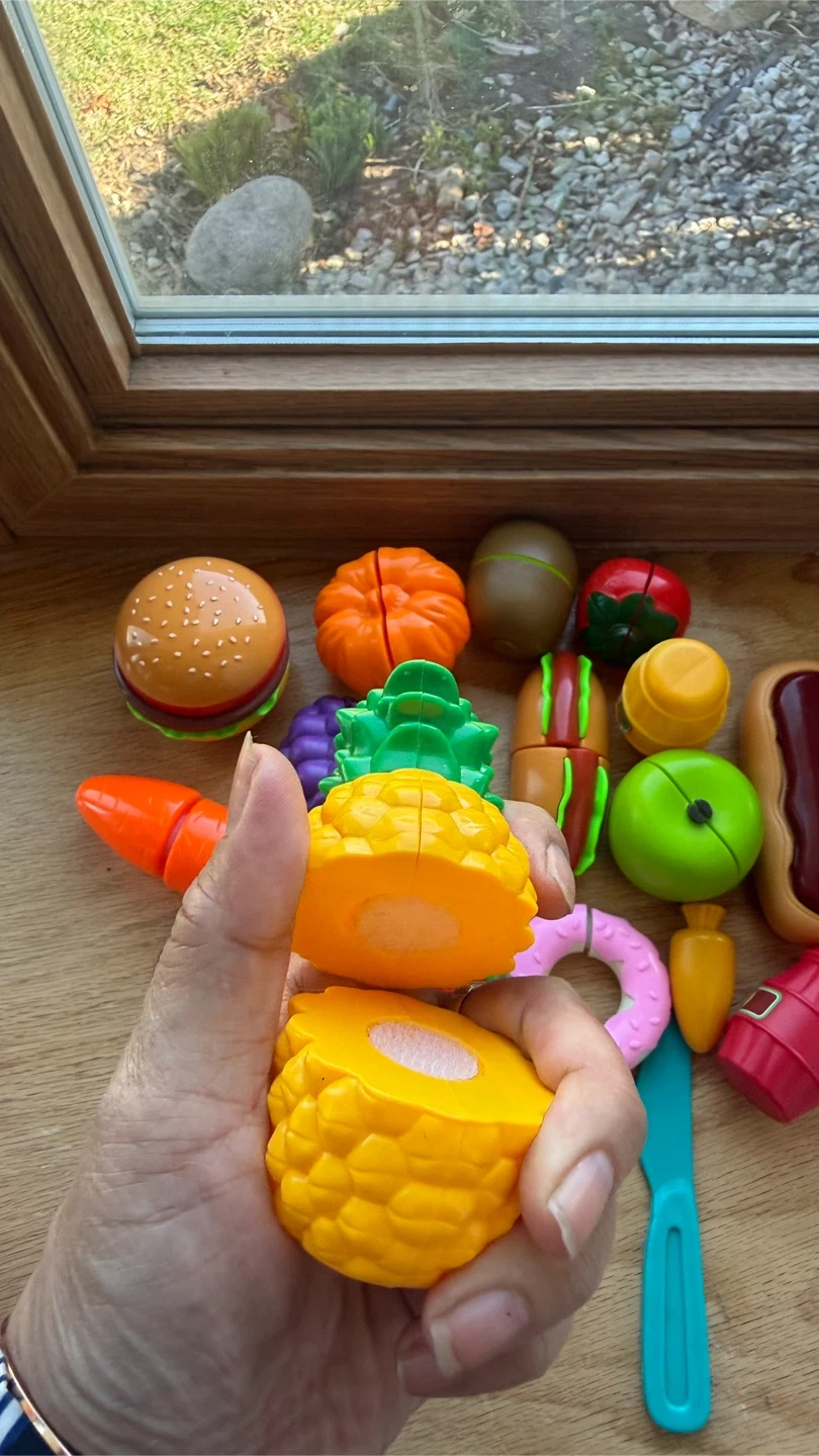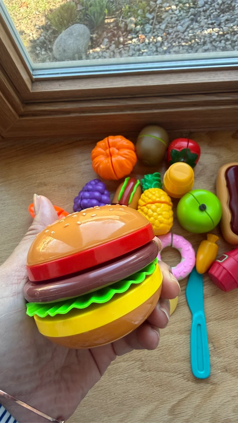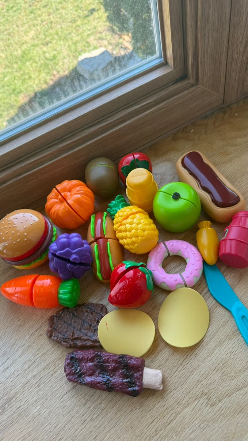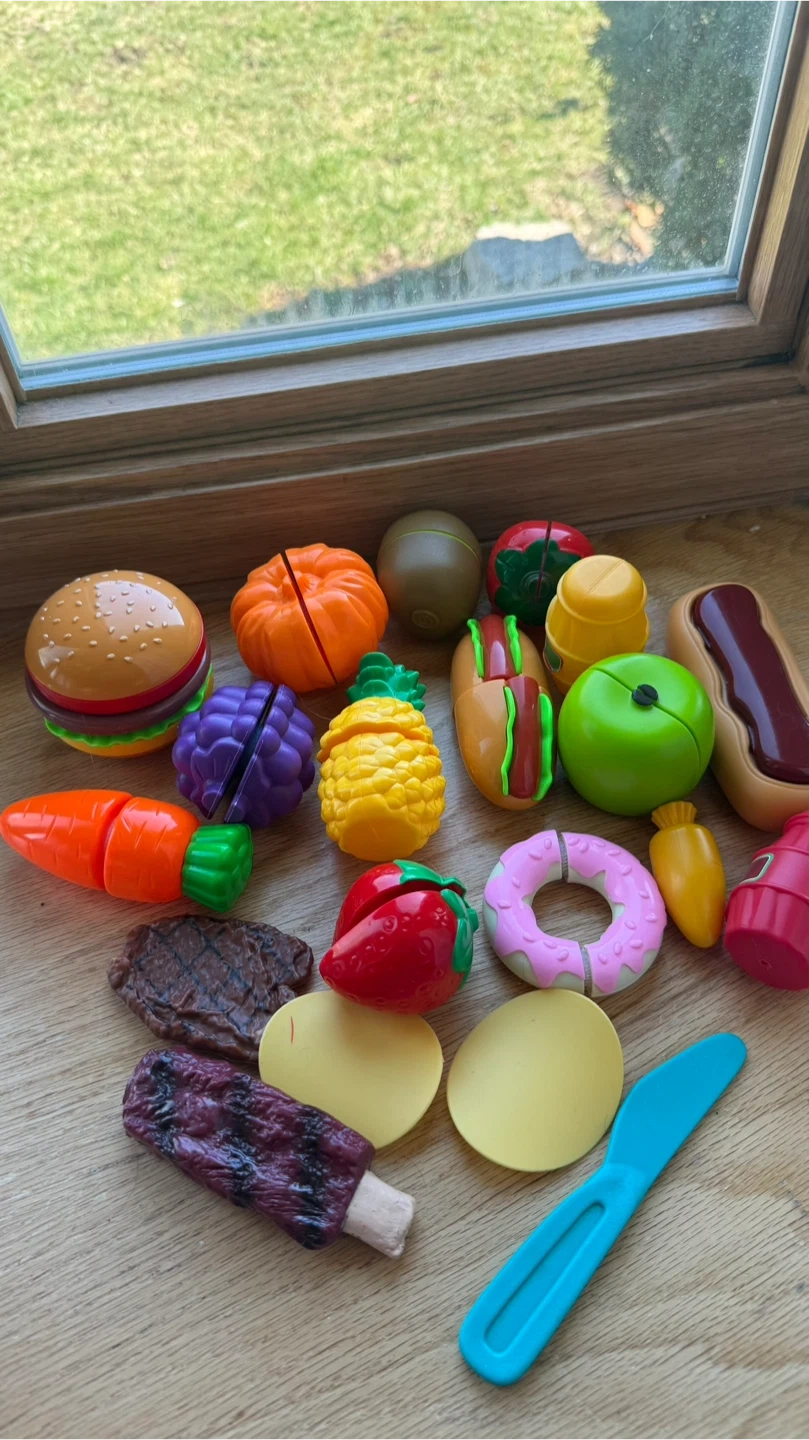 This play food set includes a variety of fruits, vegetables, and meal items. Many pieces are designed to be cut and reassembled. Includes a blue play knife and yellow plates.
