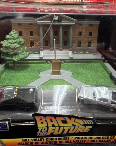 This is a NEW JADA Back to the Future Hill Valley Courthouse - Nano Scene. It's a 9" wide collectible die-cast DeLorean model from Jada Toys, featuring intricate Nano scenes from the iconic movie. A great addition for any Back to the Future fan's collection.