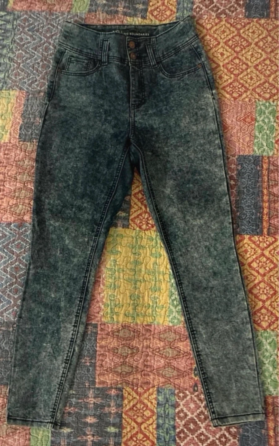 These No Boundaries jeans feature a stylish acid wash finish. They're a high-rise style with a button closure. Denim construction.