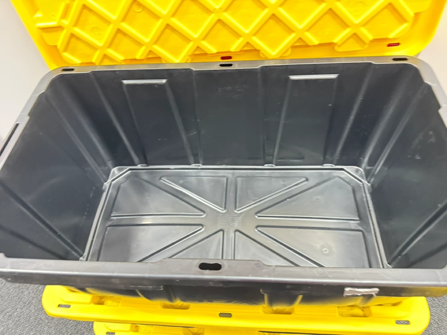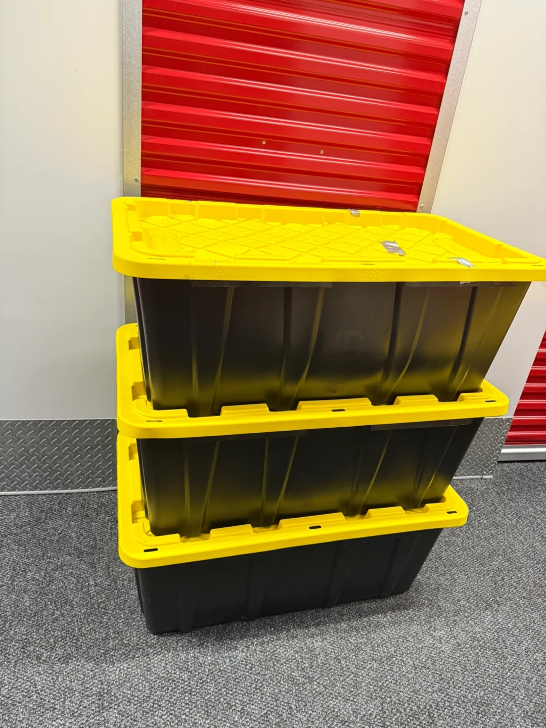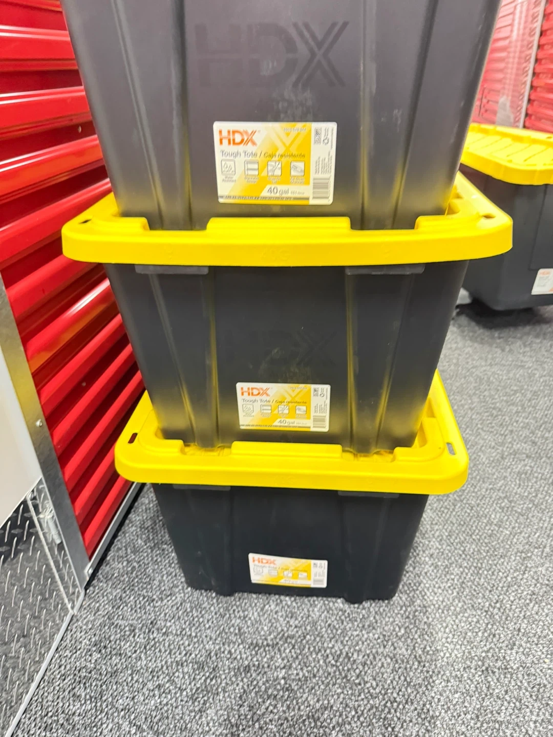 Selling HDX 40-gallon tough storage totes with yellow lids! Great for organizing and storing items. They are durable and in good condition.
