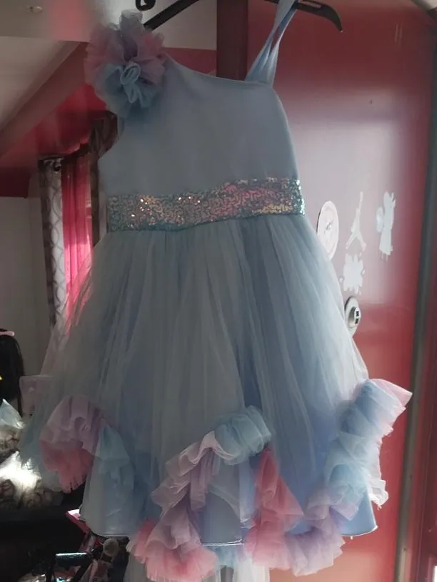 Beautiful light blue tulle dress with pink and pastel accents. Features a shimmering sequin waistband and a floral embellishment on the shoulder strap. This dress is perfect for parties or special occasions!