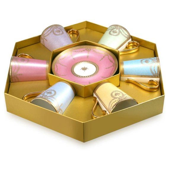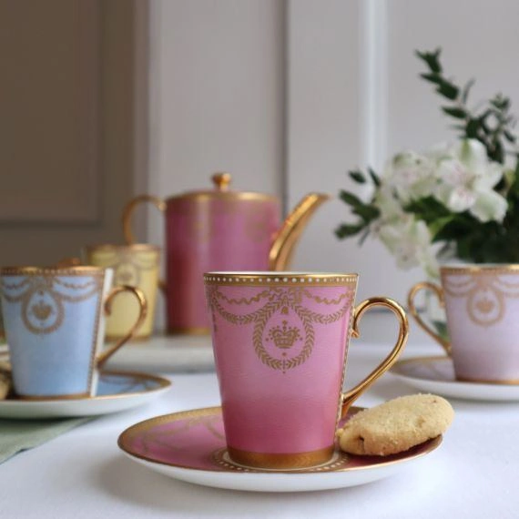 The set consists of six different colorways; pale blue, pink, turquoise blue, yellow, green, and lilac, and all the coffee cups and saucers are delicately finished with a 22-carat gold intricate design. All the pieces are made entirely by hand in Stoke-on-Trent, England using traditional methods. Not suitable for use in a dishwasher or microwave."