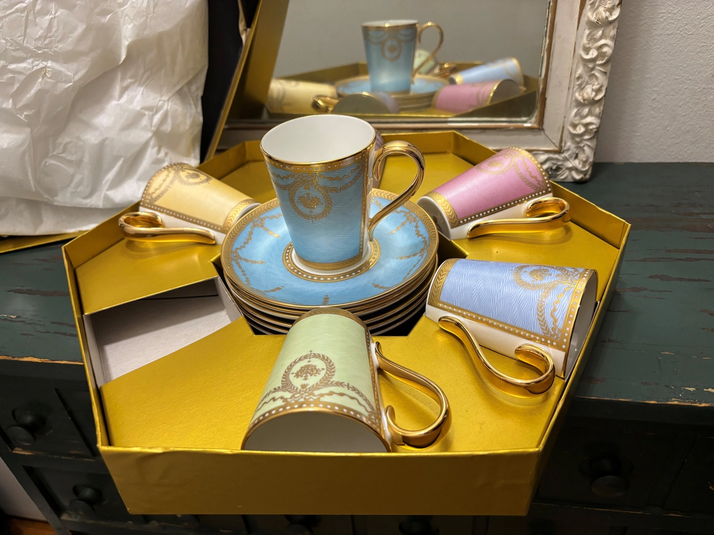 These gorgeous demitasse coffee cups, in an exquisite color palette trimmed in gold, would add luxury to any table setting. A perfect gift to the fine china collector in your life.