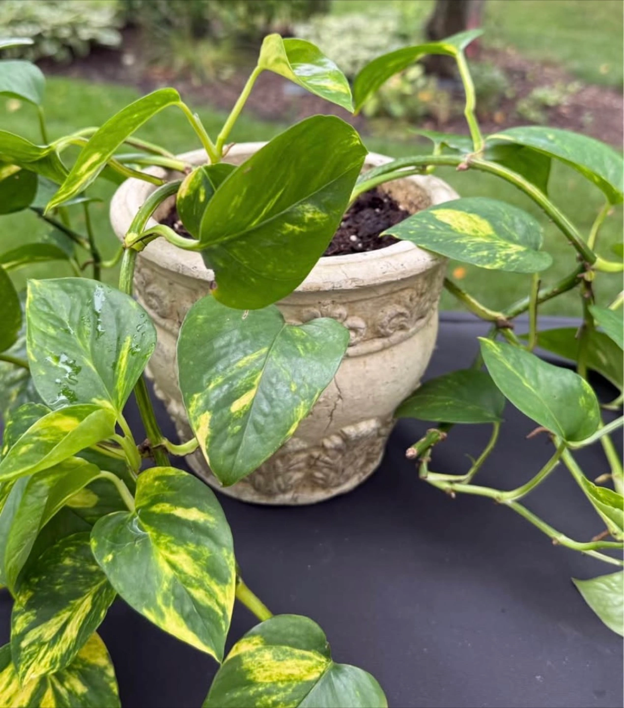 Healthy vining Pothos plant. So easy to grow Beautiful heart shaped leaves and trailing vines Transferred to another pot for pickup (last pic) Has many new growths... Pick up Schaumburg