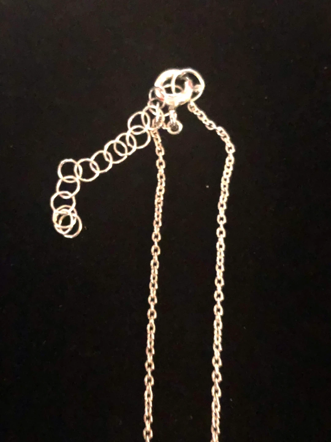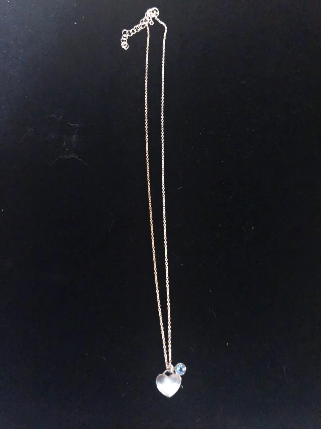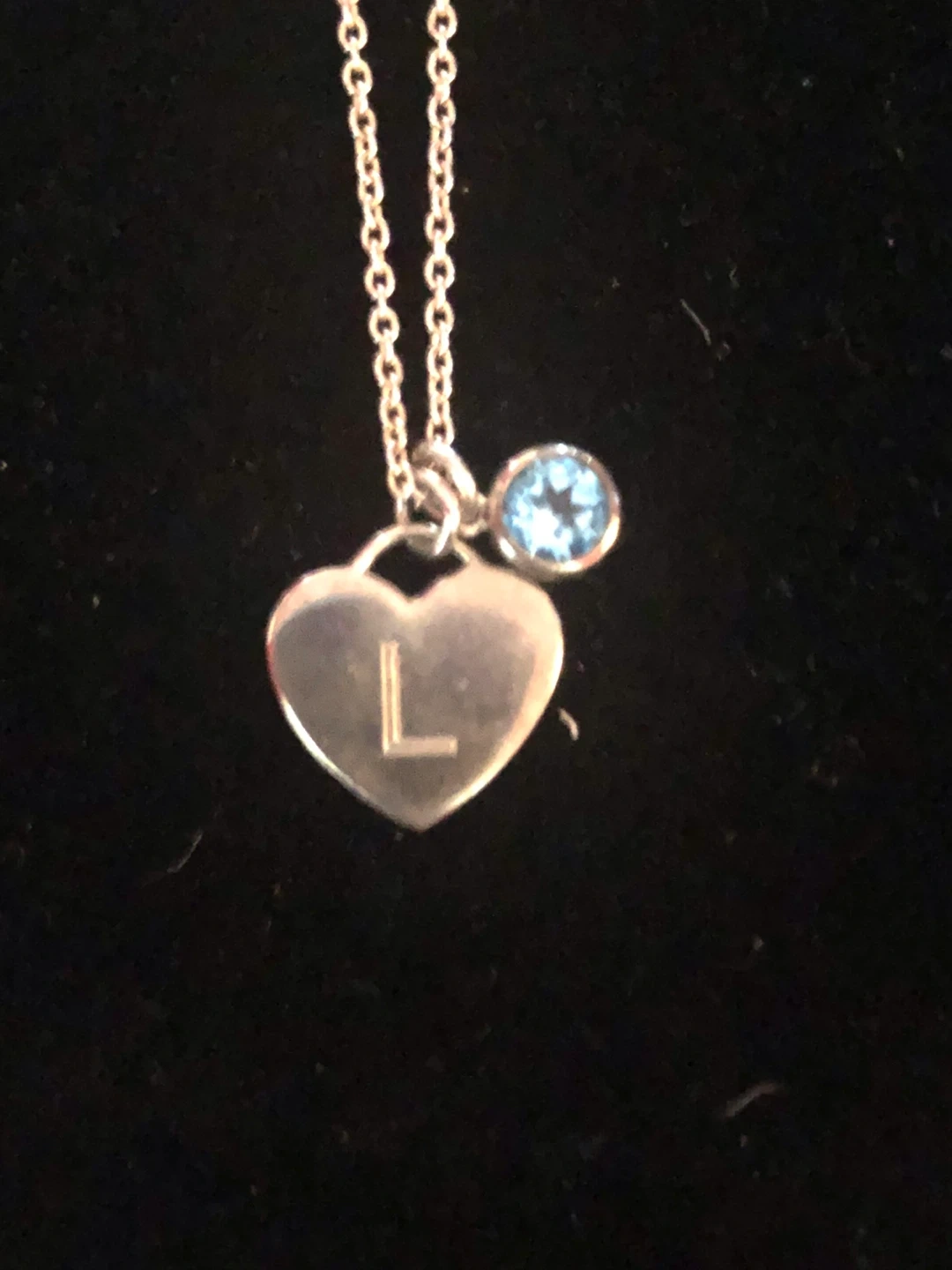 65Silver-colored heart pendant necklace with the letter "L" engraved on the heart. It also has a blue stone accent. Perfect for everyday wear!