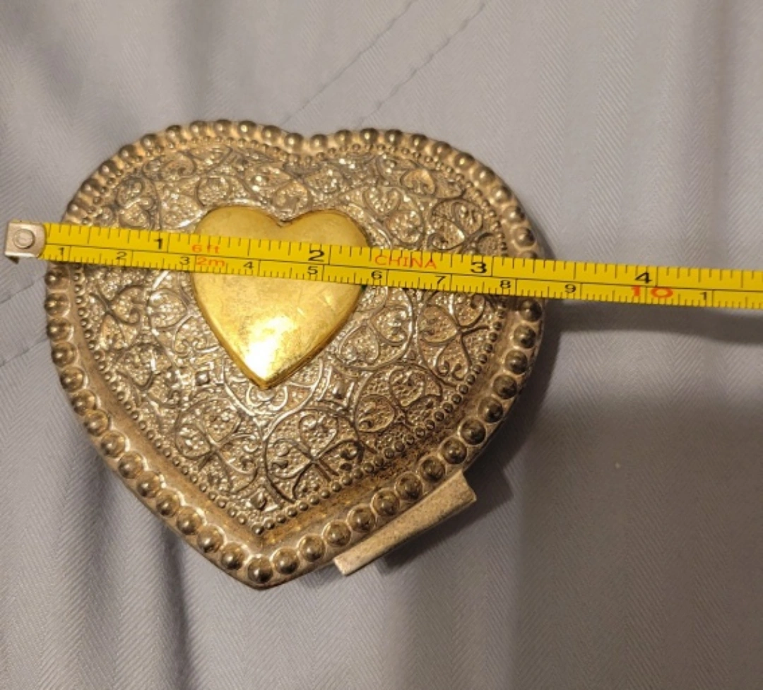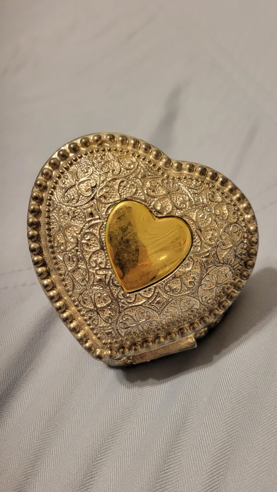 15Cute heart-shaped trinket box. It's silver with a gold heart on top and a red velvet interior. Perfect for storing jewelry or other small treasures