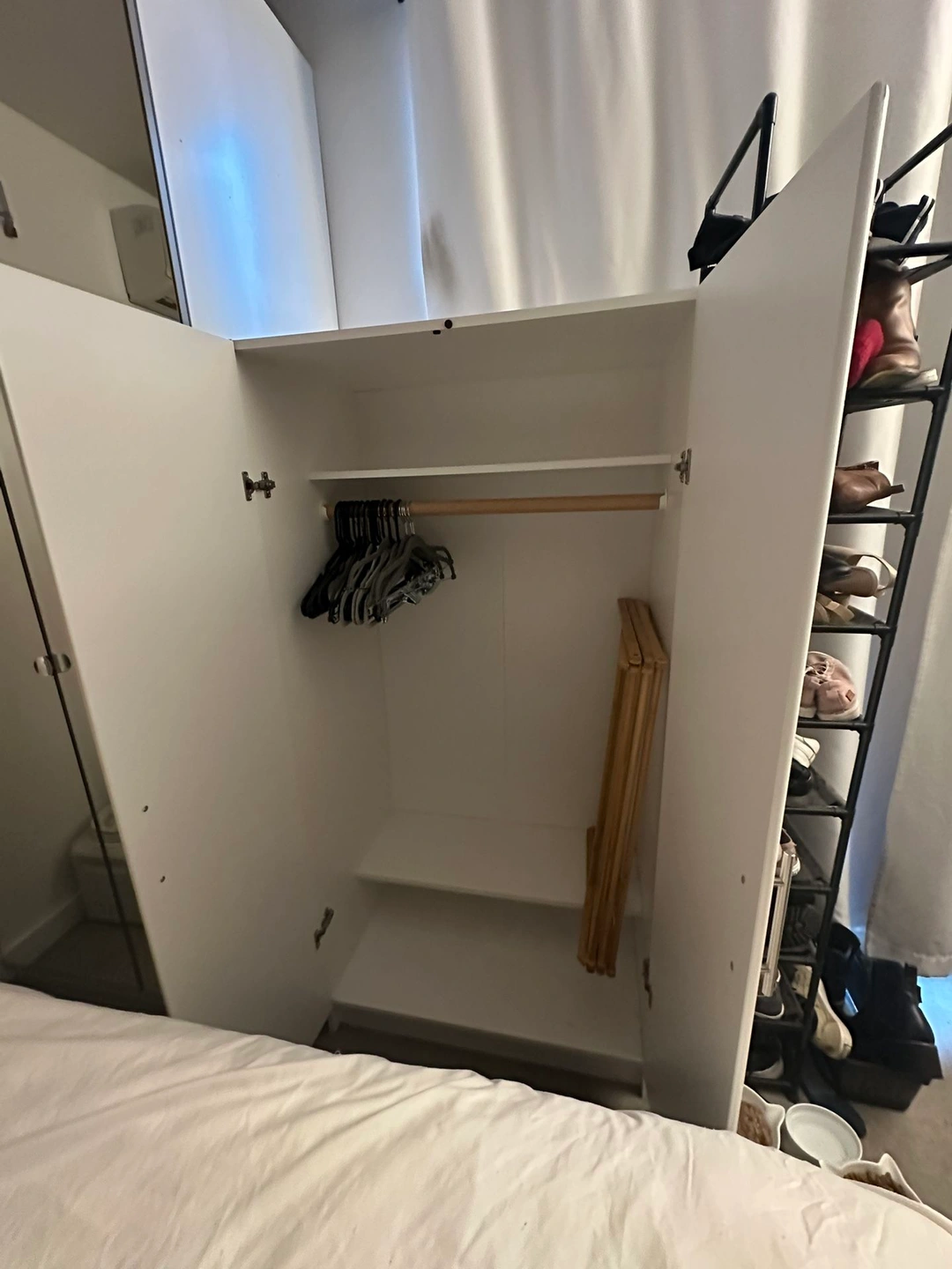 This is a perfect shoes and clothes armoire to add more closet space. 60 x 32 x 22 inches (5 feet tall). The height is low enough to put boxes or other things on top—super handy in small spaces. It’s solid/heavy but have an elevator to move. Color: White Material: Wood Item Height: 47-54 in Item Width: 31-38 in Item Depth: 12-23 in