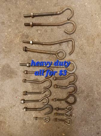 108These are metal hooks of various sizes and shapes. They have screws and nuts. They are perfect for hanging up tools and other items in the garage. The hooks may help you feel more organized and productive. all for $2. any interest. 347-285-6952, jp