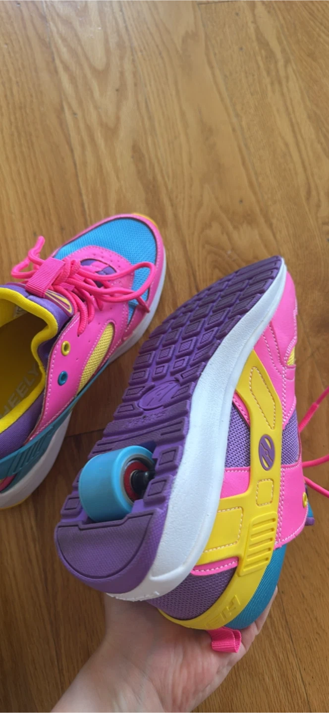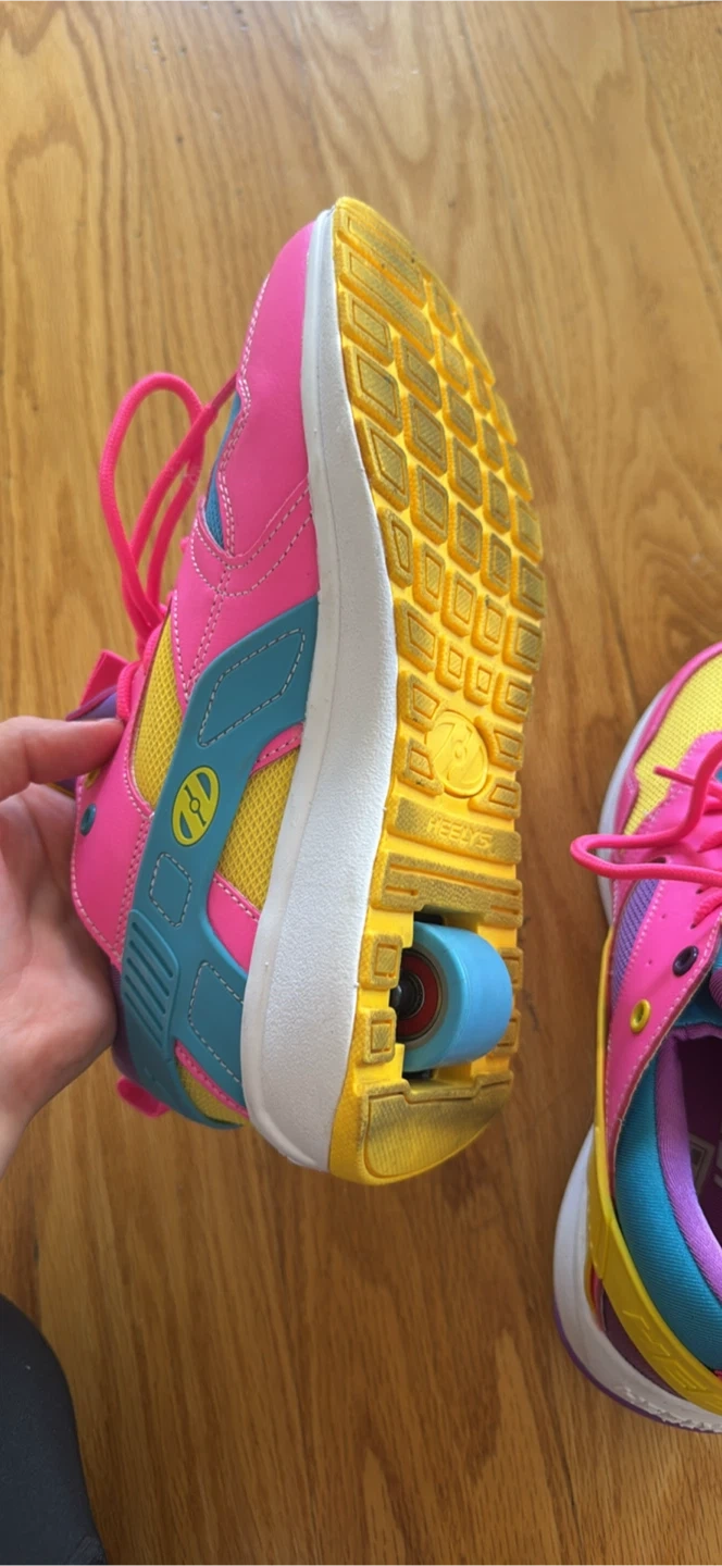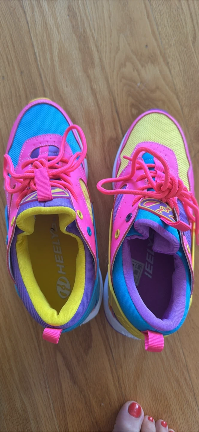 Selling a pair of Heelys roller shoes! They feature a fun color combination of pink, yellow, and blue. The wheels are in good condition and ready to roll. Perfect for some fun and exercise! Perfect for Barbie Halloween costume Size 7