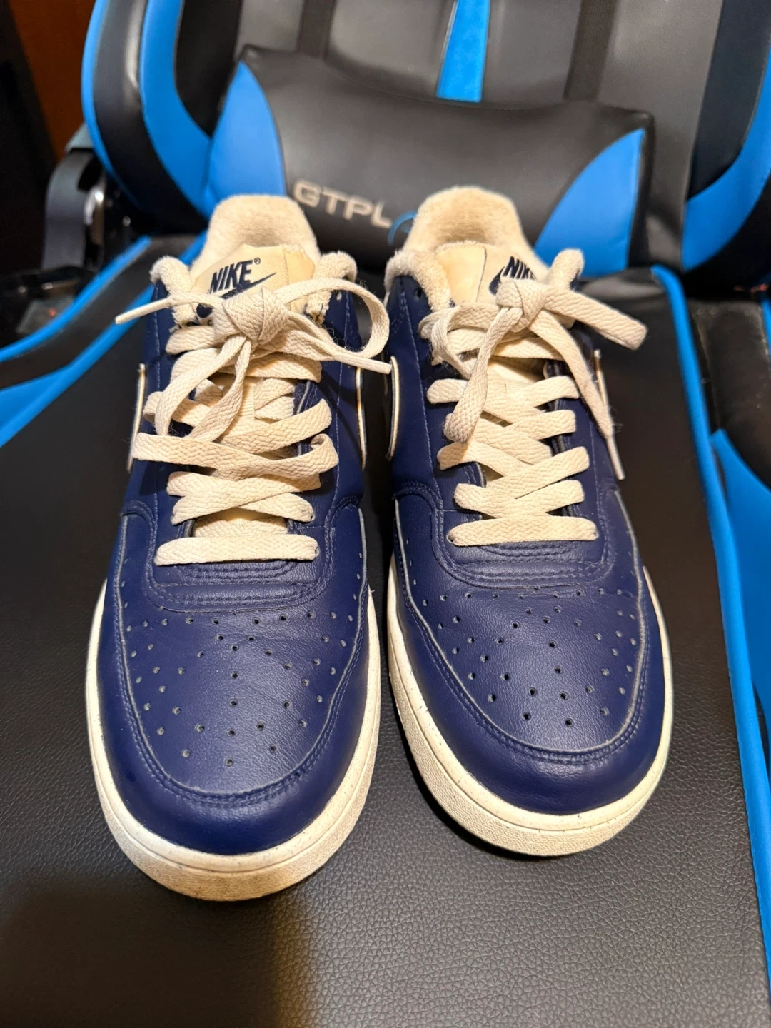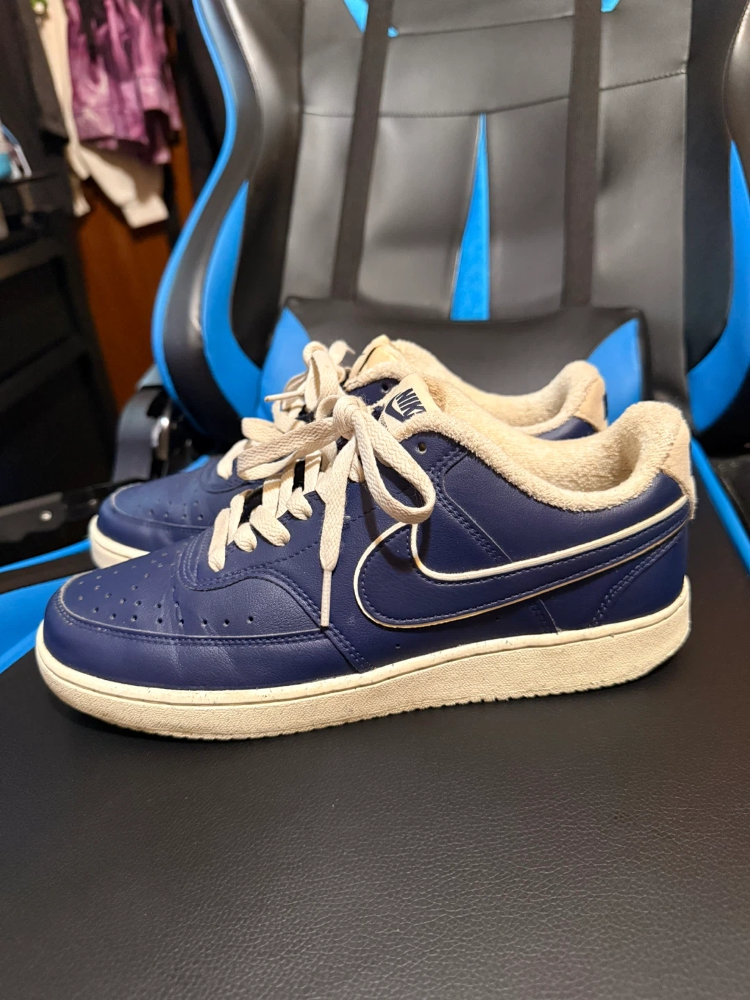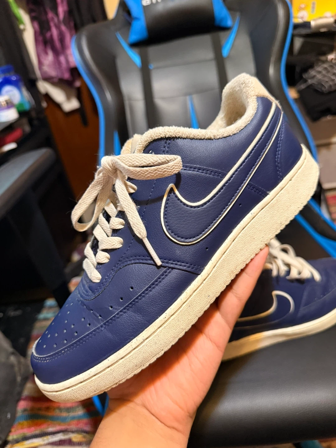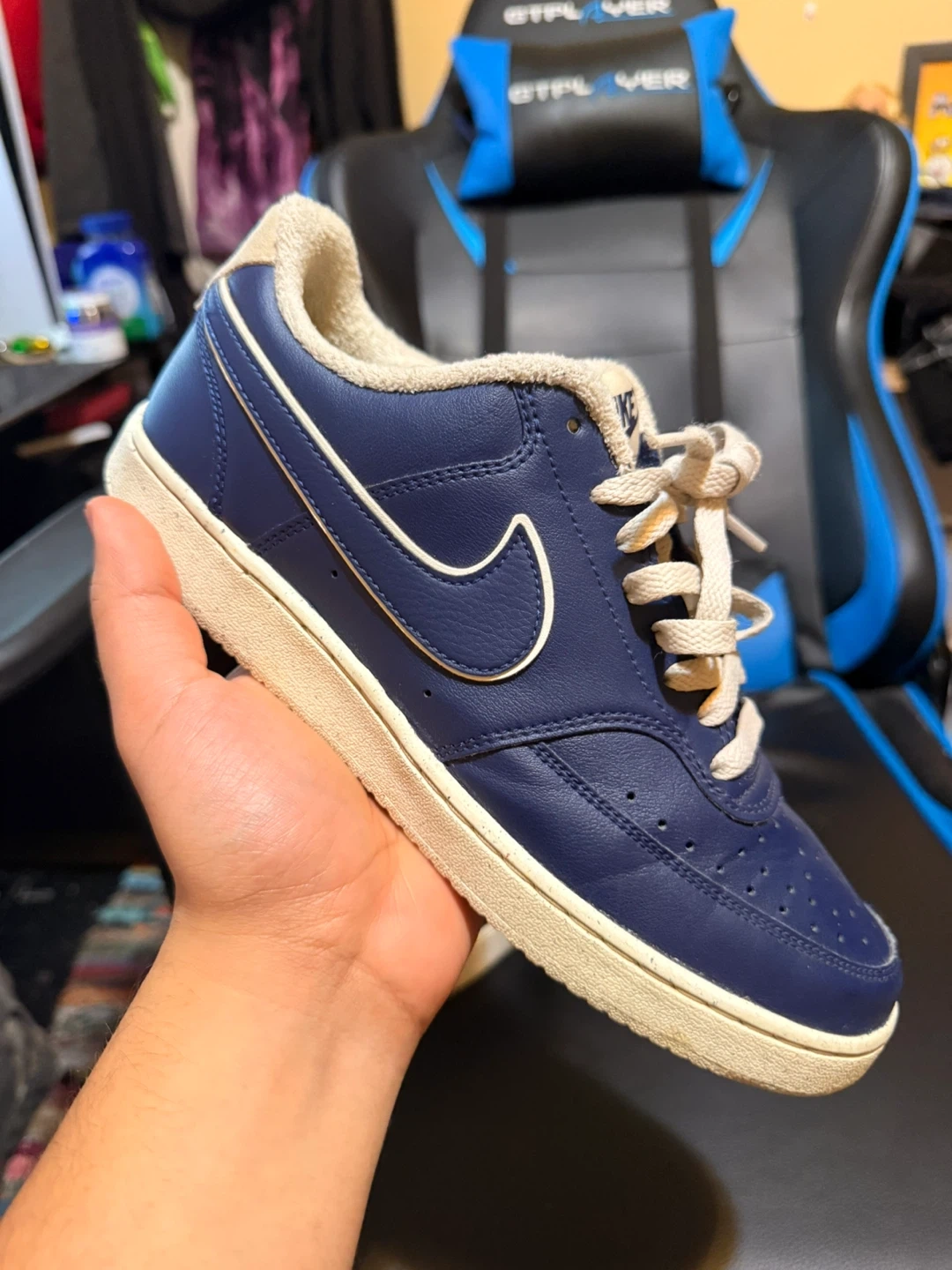 Selling a pair of Nike Court Vision Low shoes in size 8 US. They're a stylish navy blue color and in good condition! The shoes have a retro look with a modern twist. Perfect for everyday wear!