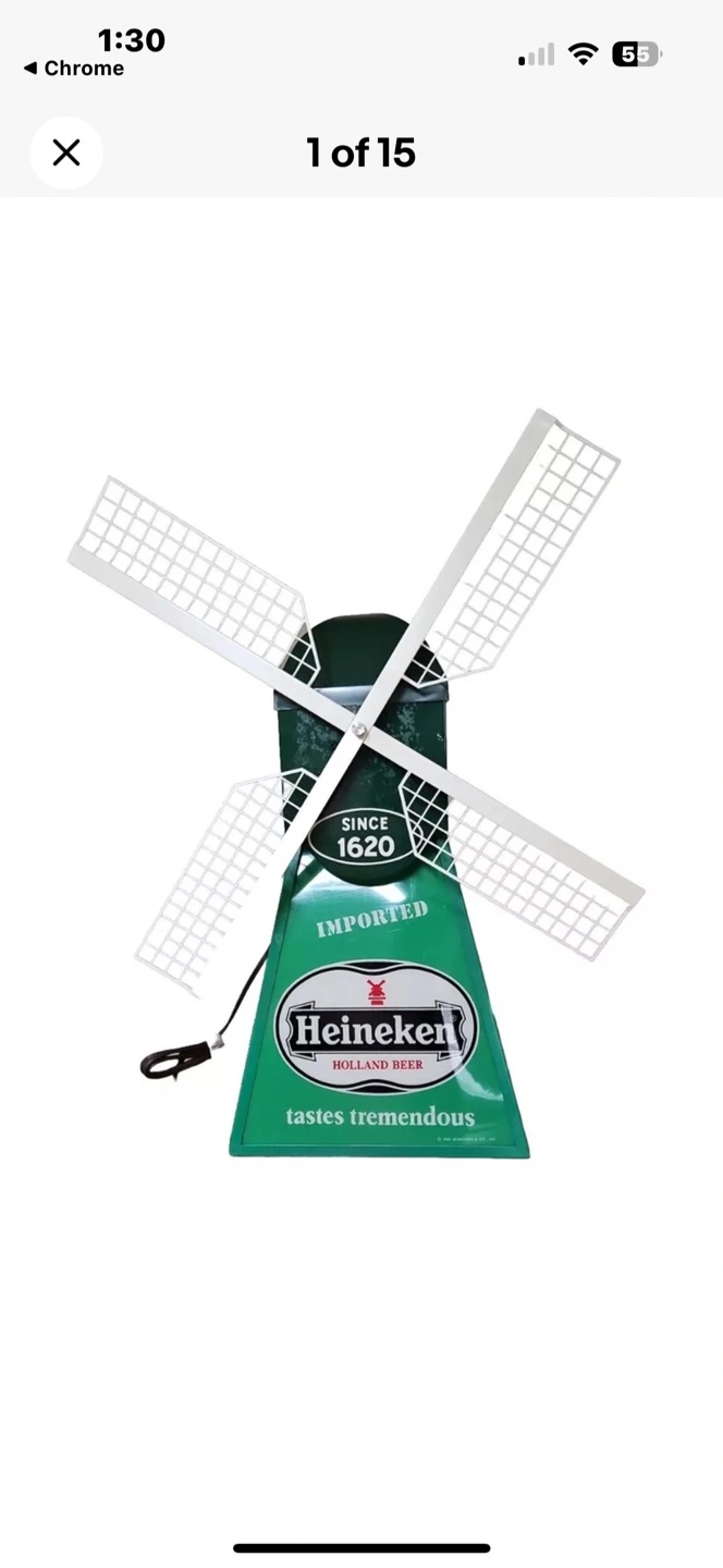 Windmill design with a green base. It has a white grid design, the blades of the windmill cross the green base. The sign is branded with the Heineken logo and tagline. Use it as a decorative piece to remind you of the good times. Brand new still in the box.
