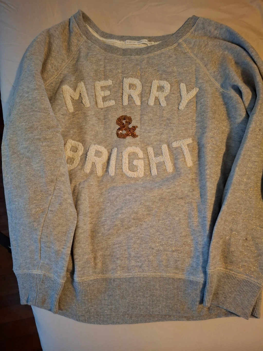 60Selling a light gray sweatshirt with the words "Merry & Bright" on the front. It's in great condition and ready for the holidays