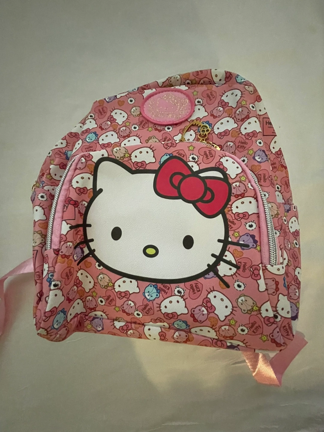 49Small Hello Kitty backpack with a pink and white pattern. Has a zipper on both sides and a small zipper pocket on the front. Comes with a small detachable charm.
