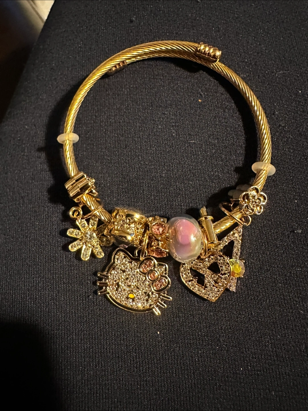 Selling a cute gold charm bracelet featuring Hello Kitty and other fun charms! It's in great condition and ready for a new home
