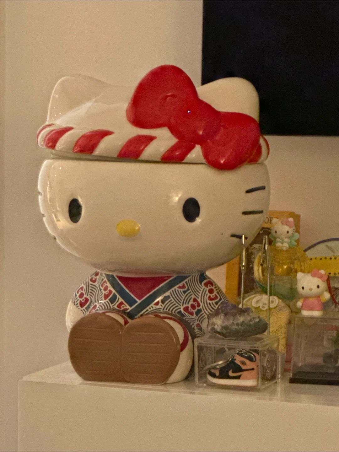 Selling a cute Hello Kitty cookie jar! It's in great condition and ready to hold your favorite treats. The jar features Hello Kitty in her classic design with a red bow and a colorful outfit. Perfect for any Hello Kitty fan or as a charming addition to your kitchen decor
