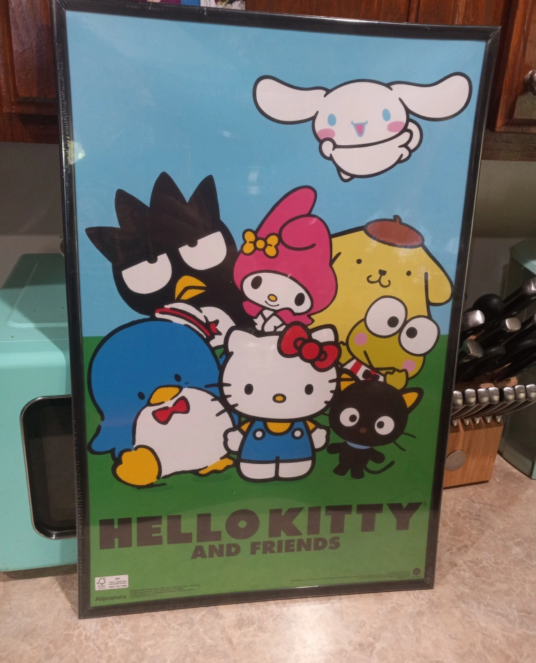 new in plastic, framed. hello kitty and Sanrio friends poster