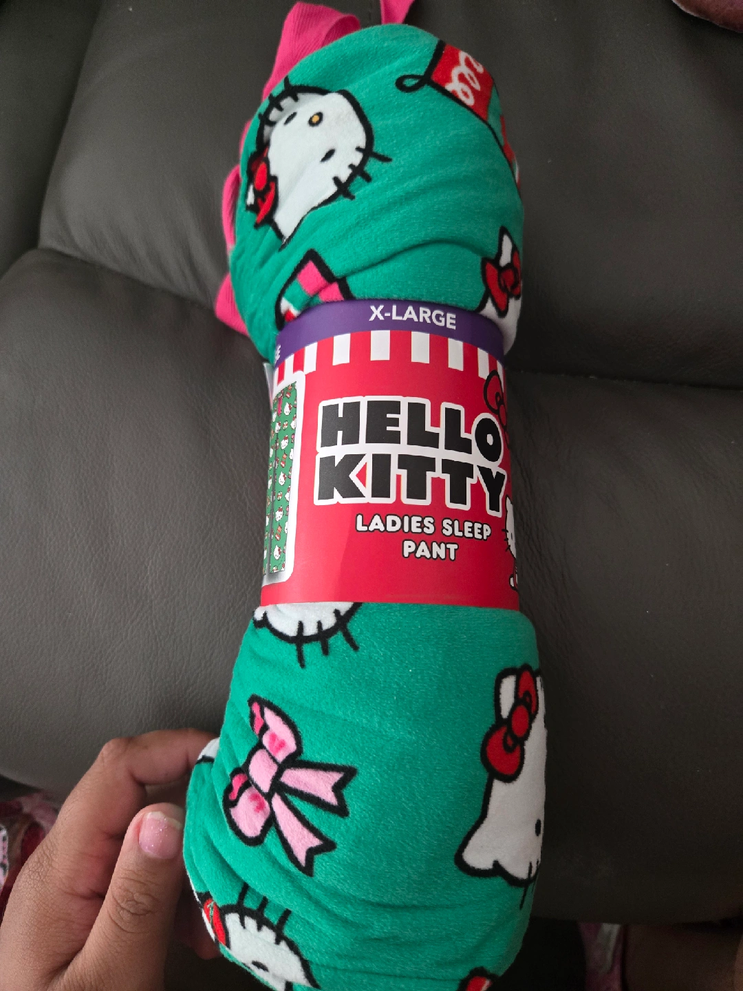 Hello Kitty ladies sleep pants in size X-Large! They are green with a Hello Kitty pattern. Perfect for lounging around the house