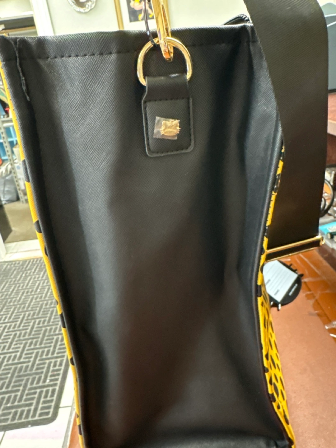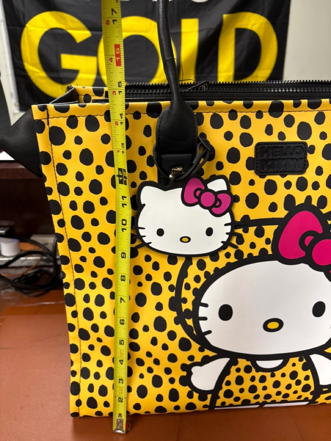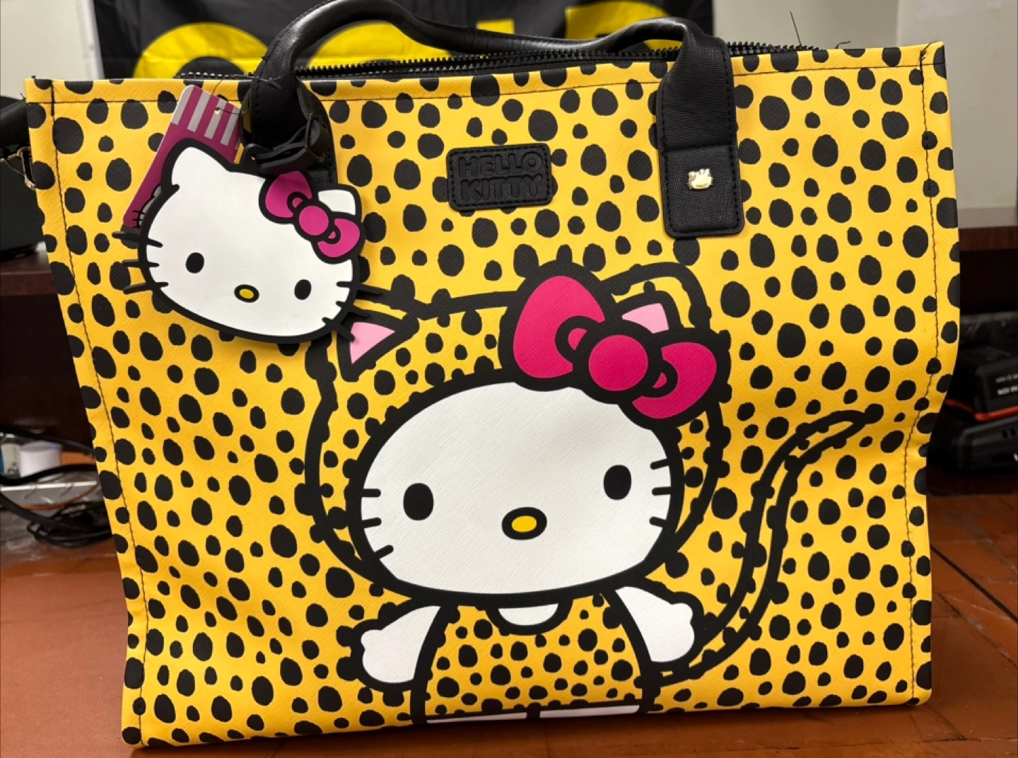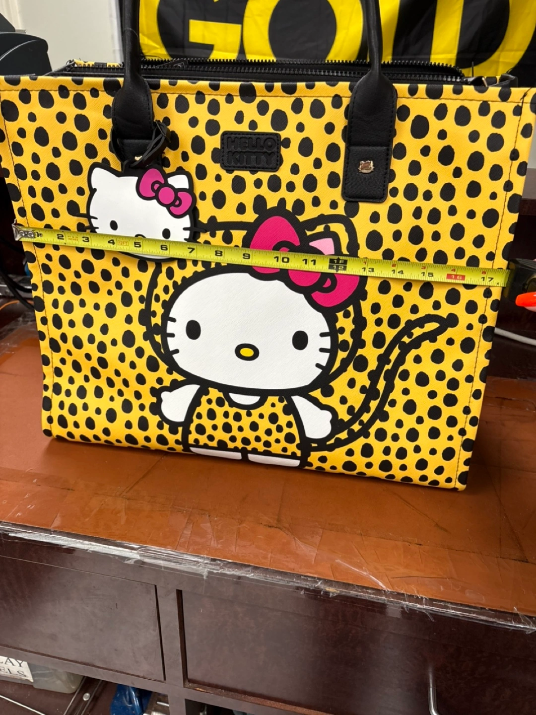 Large tote bag. Features Hello Kitty in a leopard costume. Yellow and black leopard print. Black accents. Zipper closure. Interior pocket. Great for everyday use.