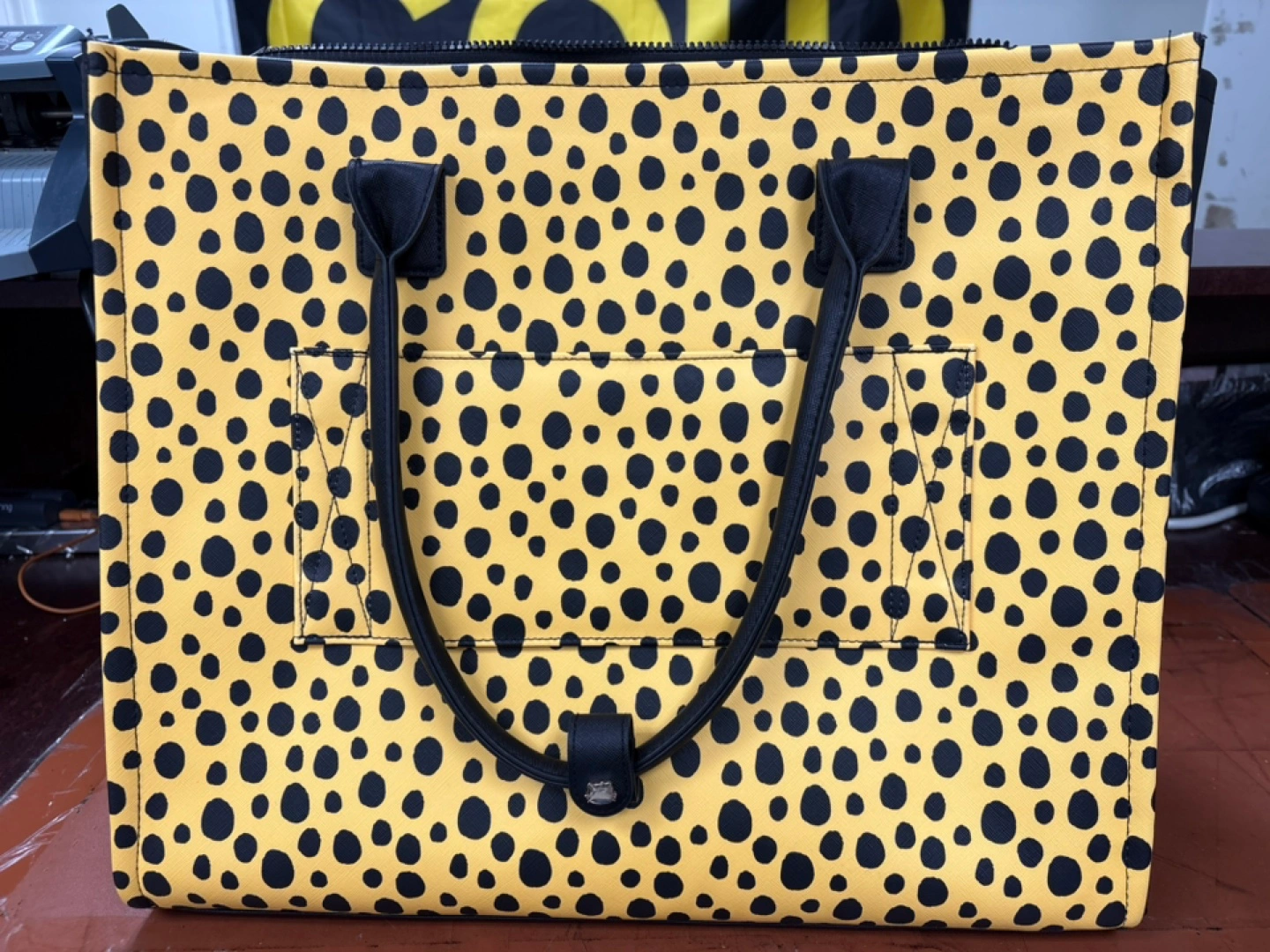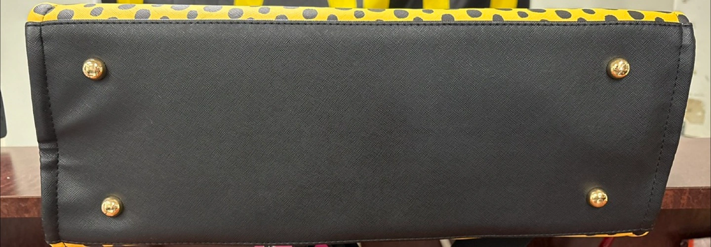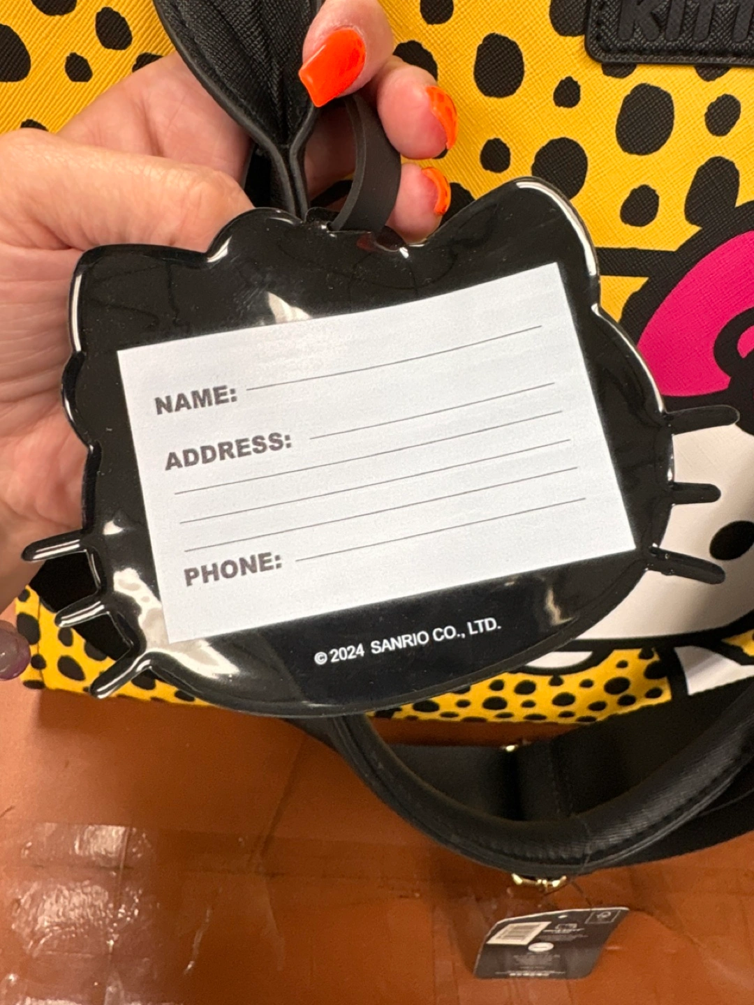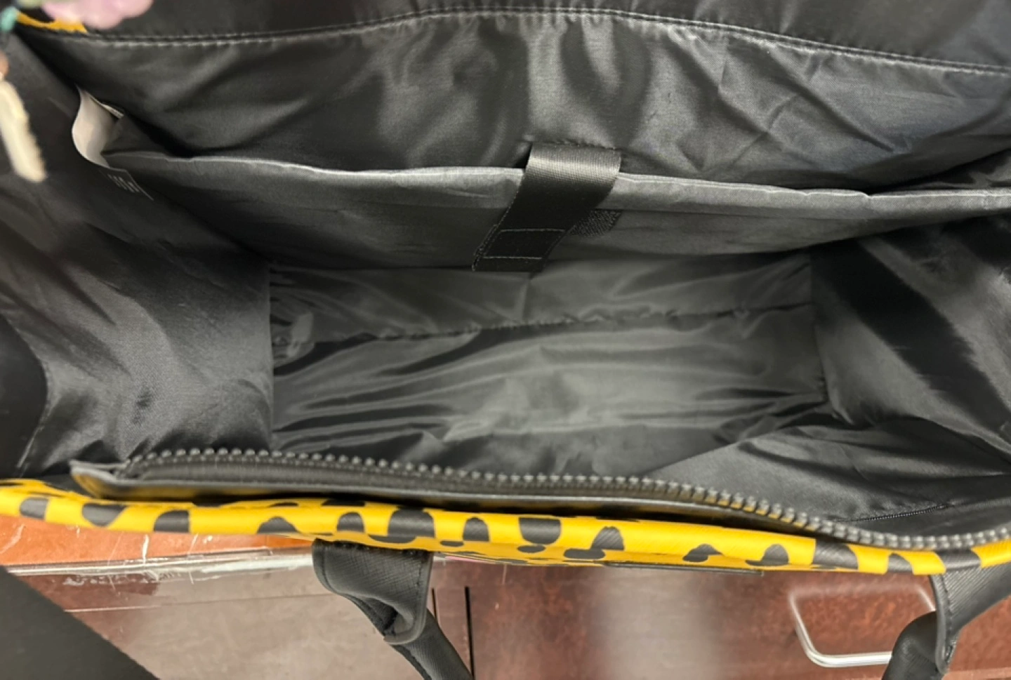 Large tote bag. Features Hello Kitty in a leopard costume. Yellow and black leopard print. Black accents. Zipper closure. Interior pocket. Great for everyday use.