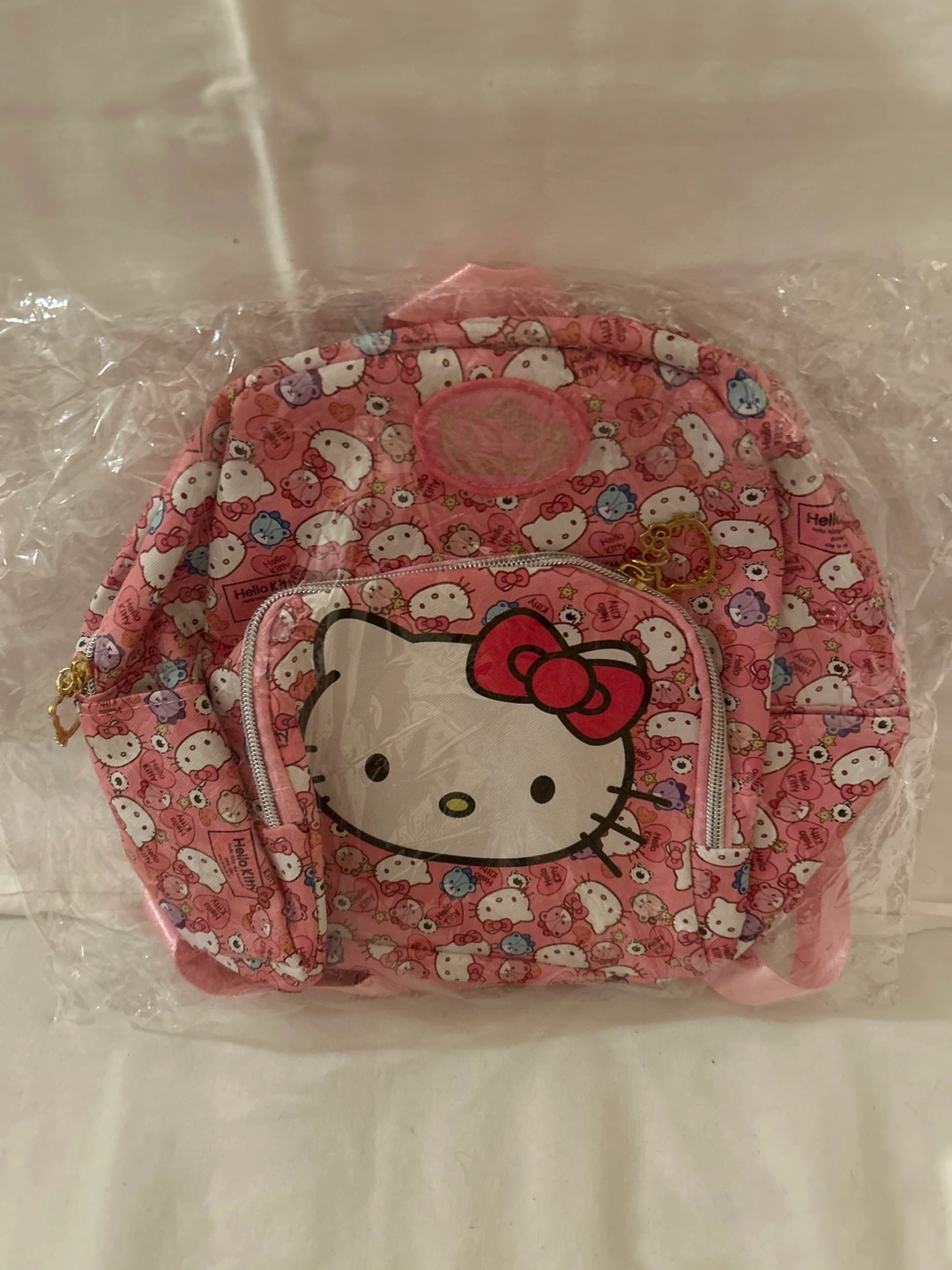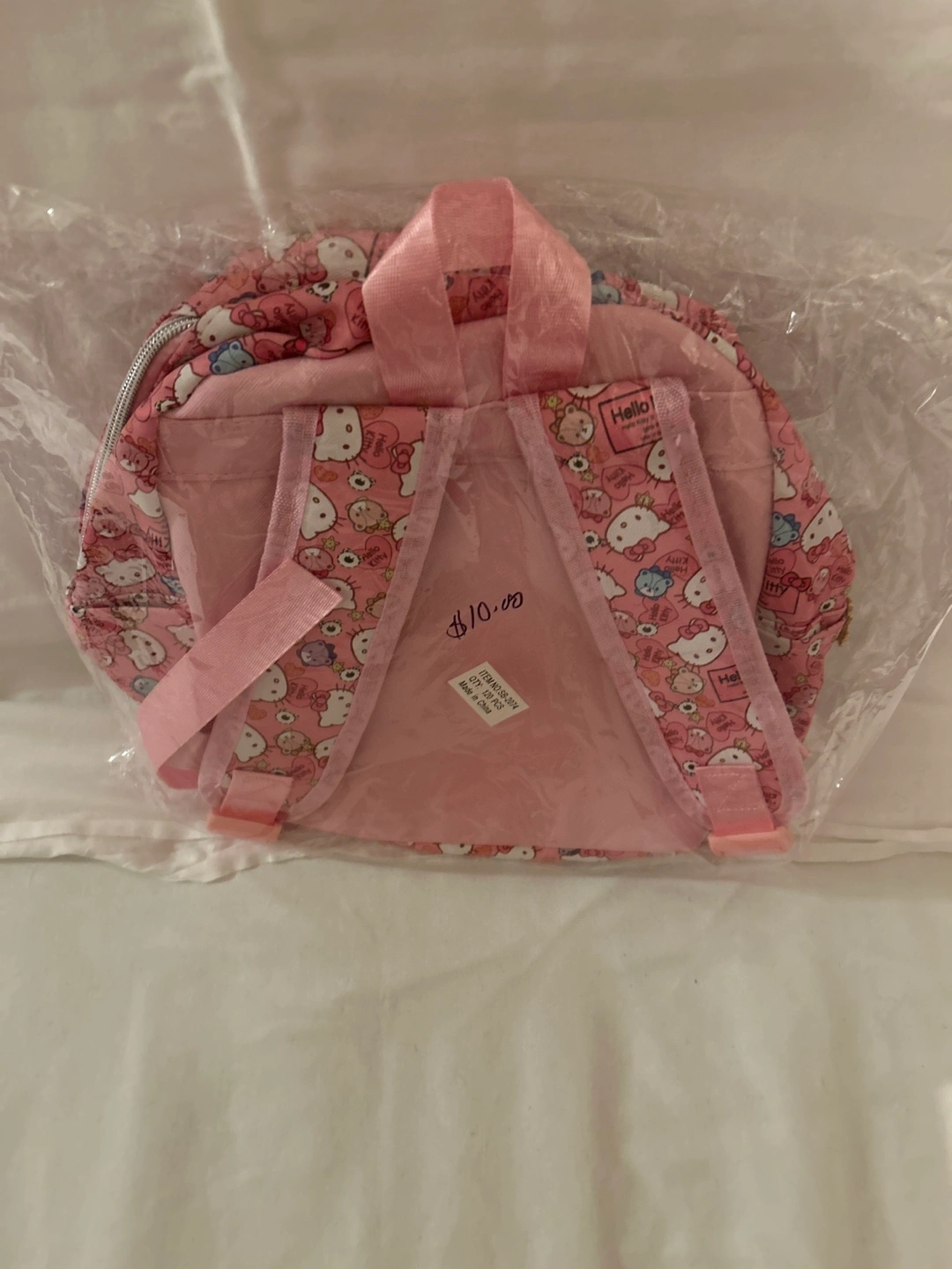 49Pink Hello Kitty mini backpack with Hello Kitty print all over. Has a zipper closure and adjustable straps. New, never used, and in original packaging.