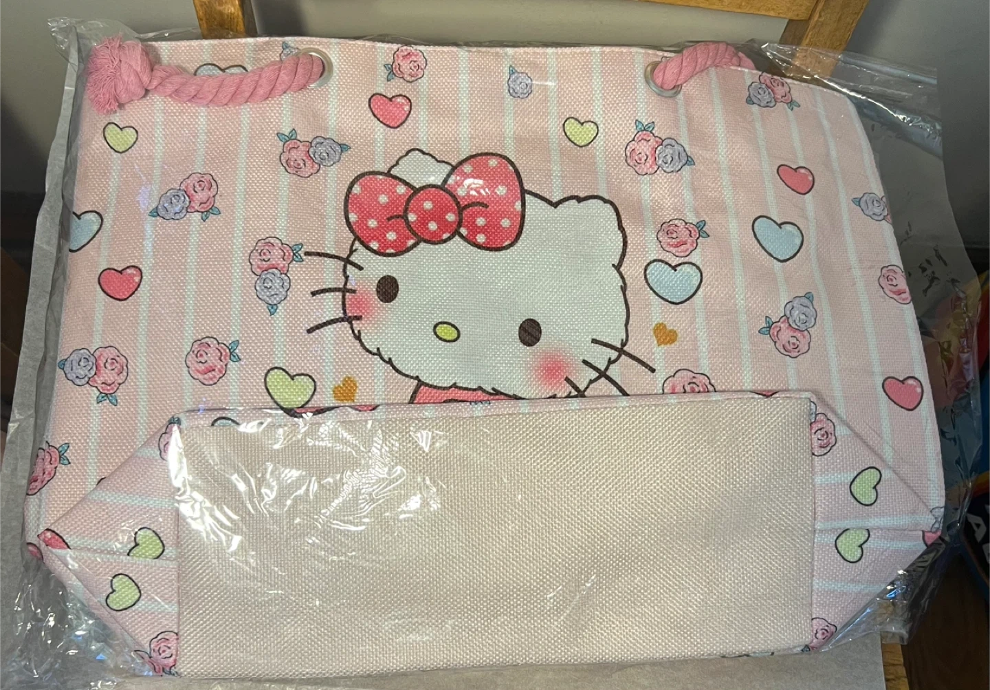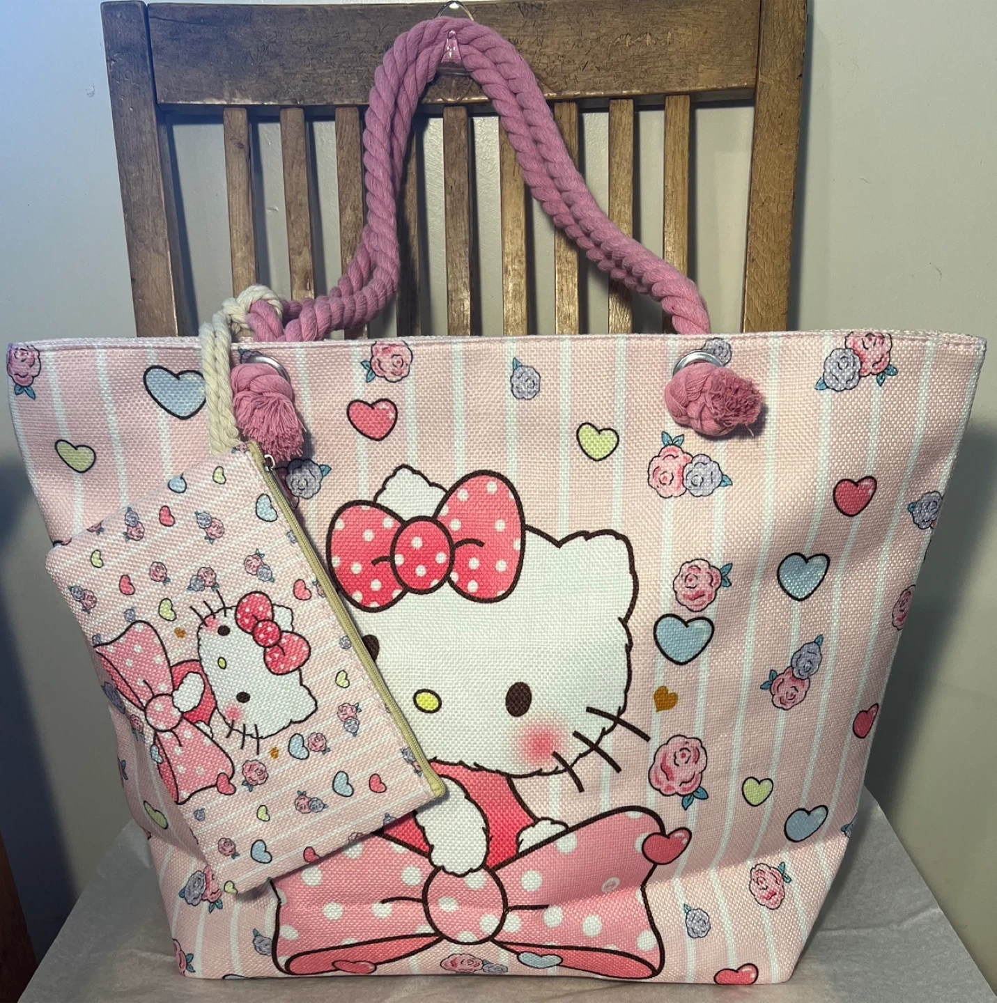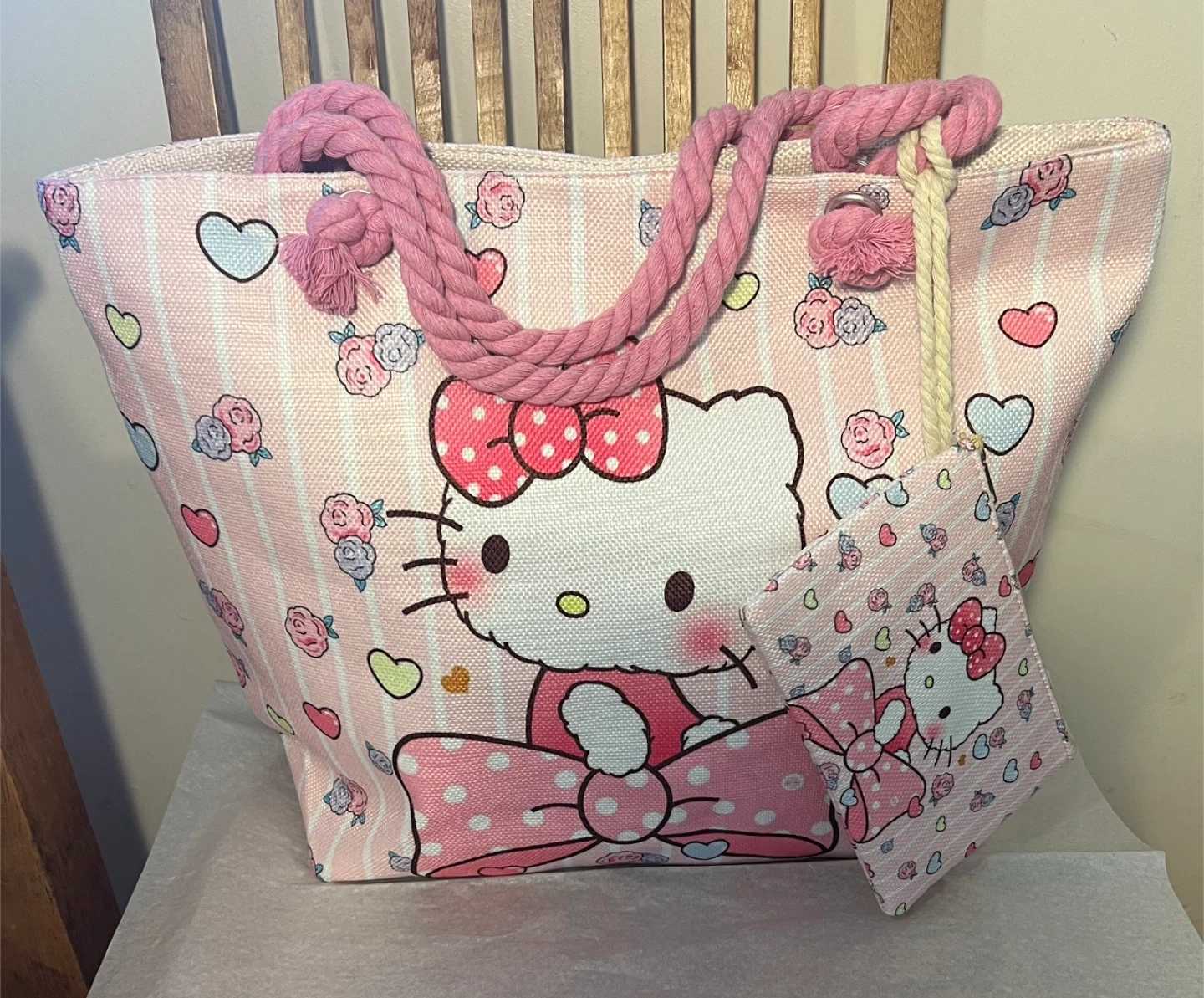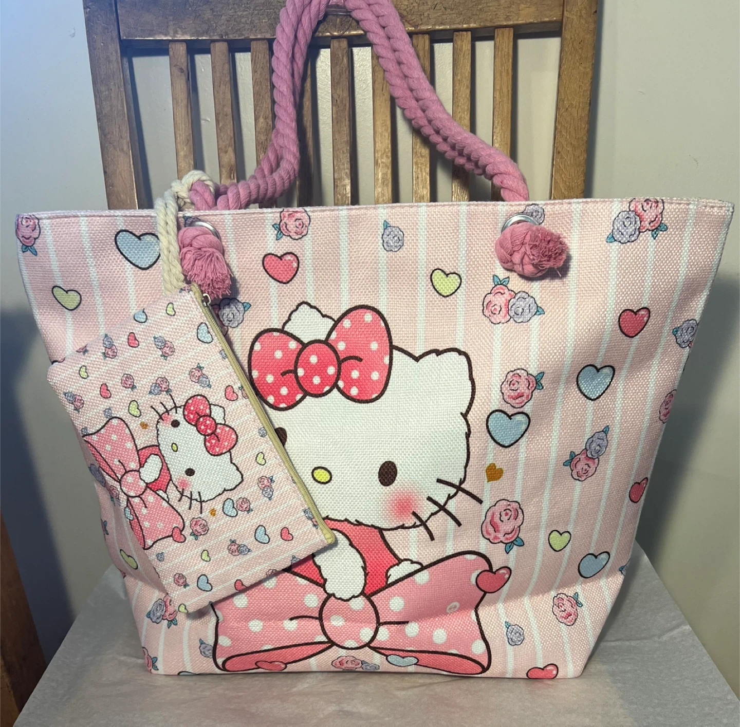 Super cute Hello Kitty tote bag in pink with a matching pouch! The bag features a fun Hello Kitty design with hearts and roses. Perfect for carrying your essentials in style