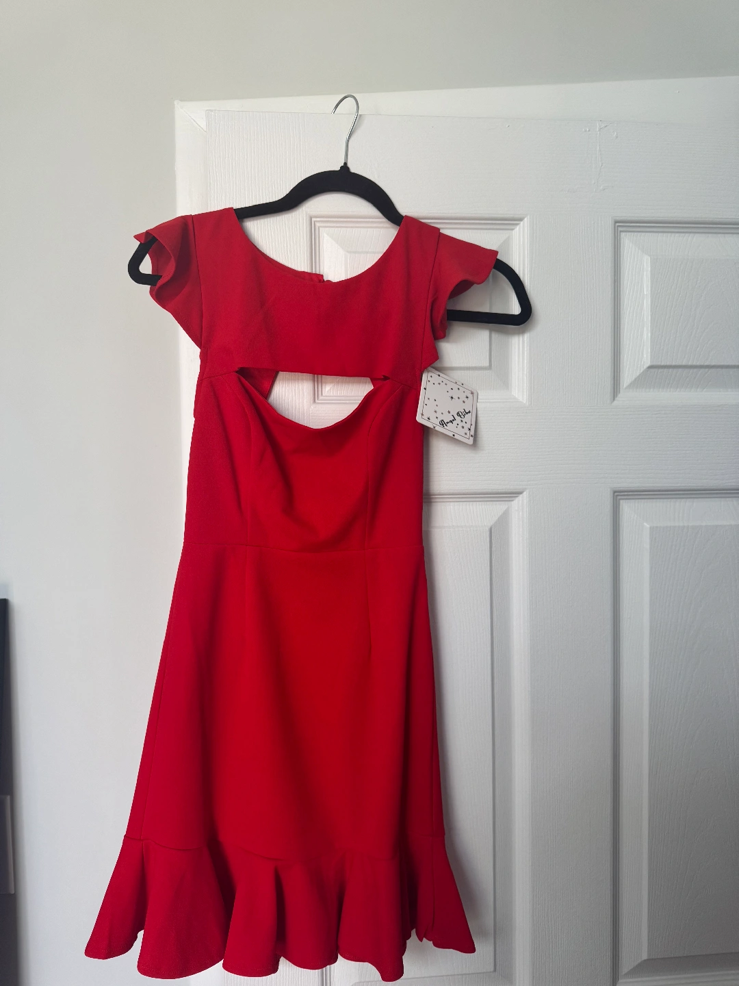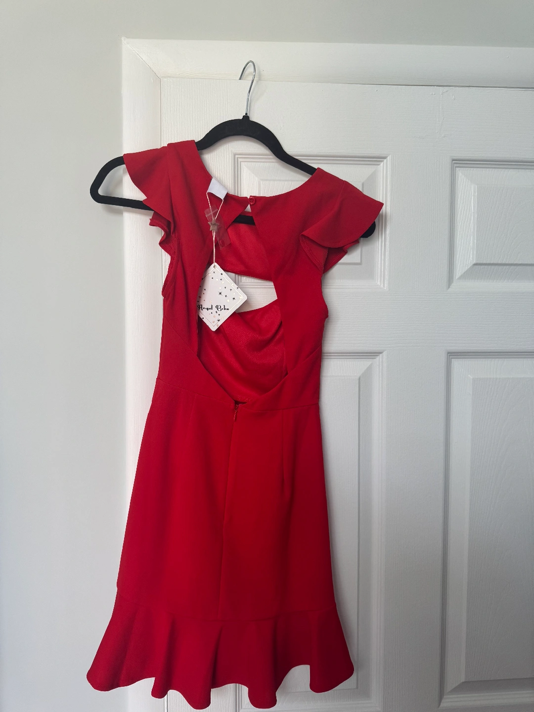 15Here's a cute red dress from Hello Molly. features a unique open back design and ruffle detailing at the bottom. Perfect for a night out or a special occasion, graduation, birthday
