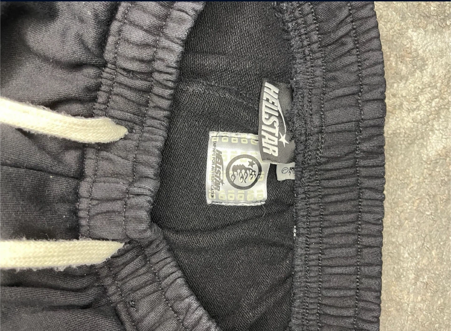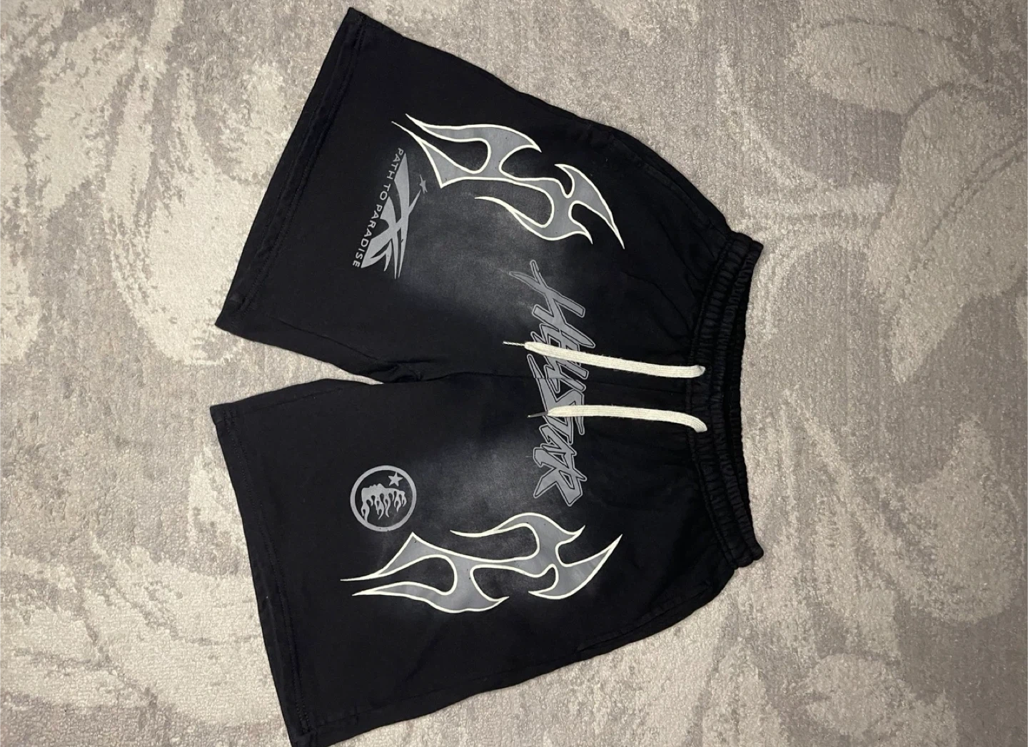Selling a pair of black HELSTAR shorts. They feature a unique design with white drawstrings and eye-catching graphics. These shorts are great for casual wear and add a touch of style to any outfit