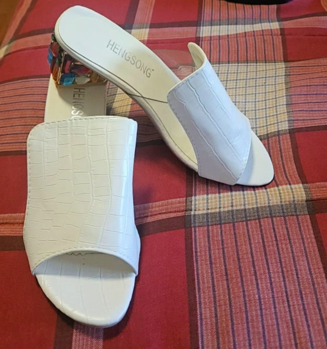 65Cute white slide sandals with a unique gemstone heel! These are perfect for adding a little sparkle to your outfit. They appear to be in good condition and ready for a new home