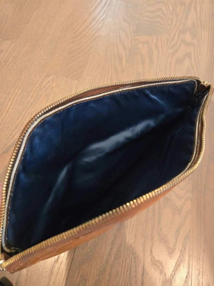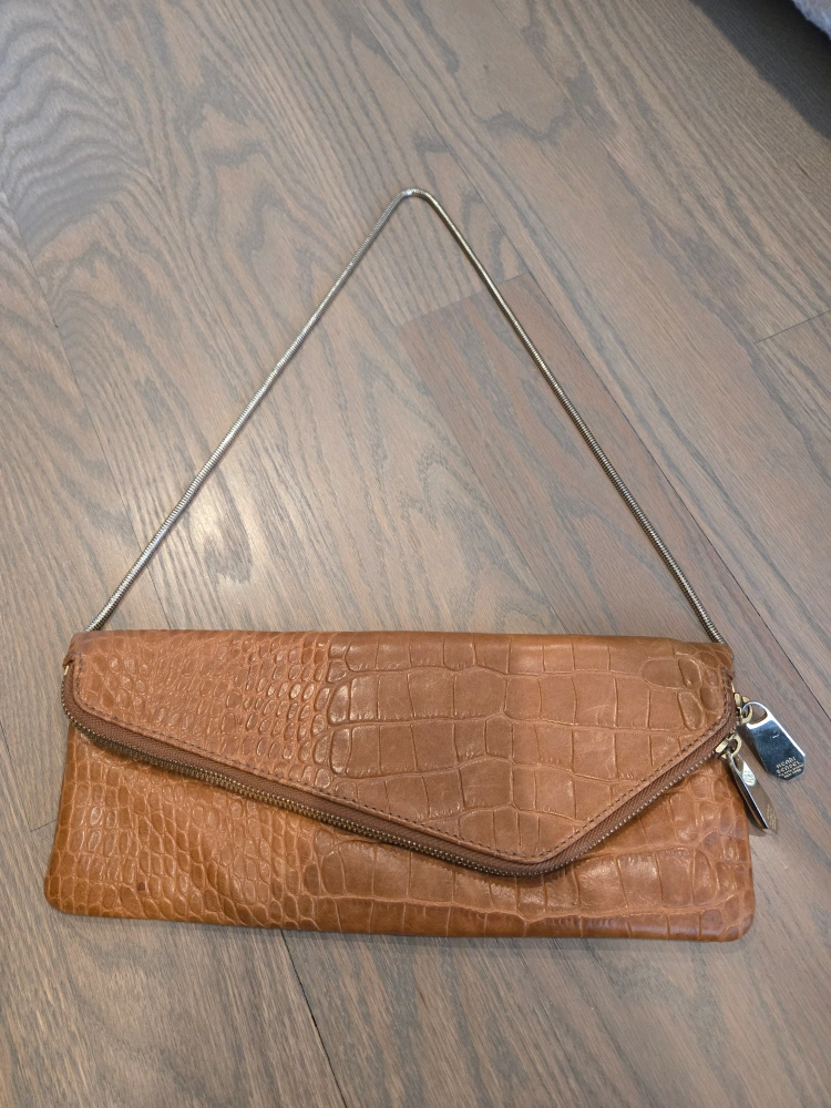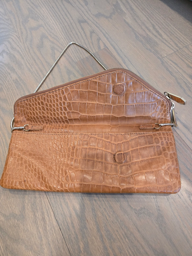 Selling a versatile clutch in brown leather.. It has a unique textured design and a convenient zipper closure. Perfect for evenings out or special occasions! good condition though zipper is a bit sticky