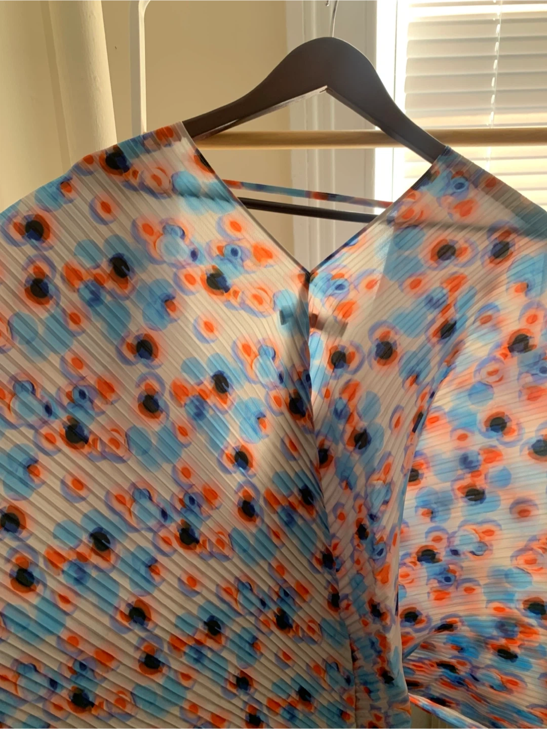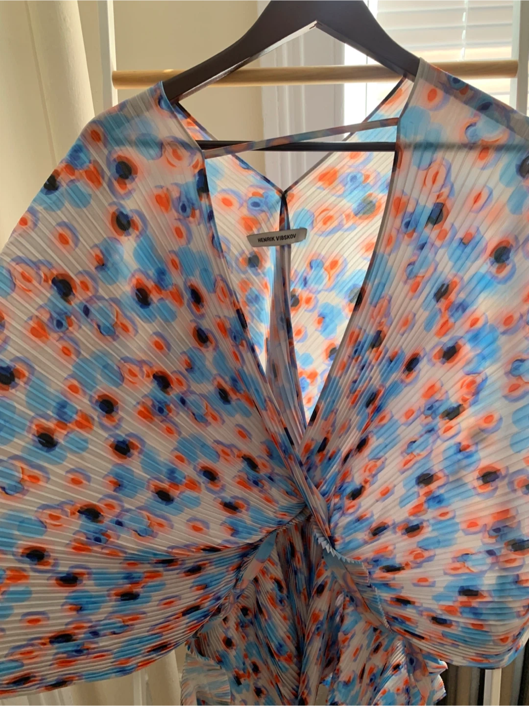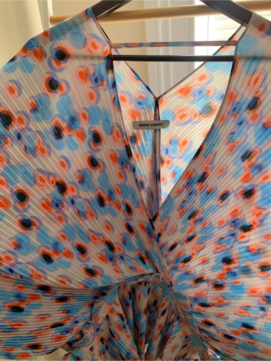 Selling a Henrik Vibskov top with a unique pleated design and a vibrant floral pattern. The colors are a mix of blue, orange, and black on a white background. It's in great condition and ready for a new home!