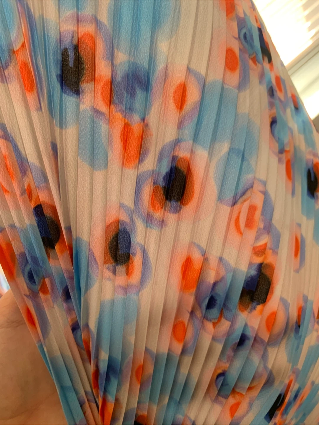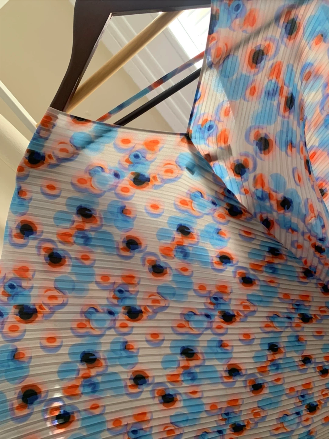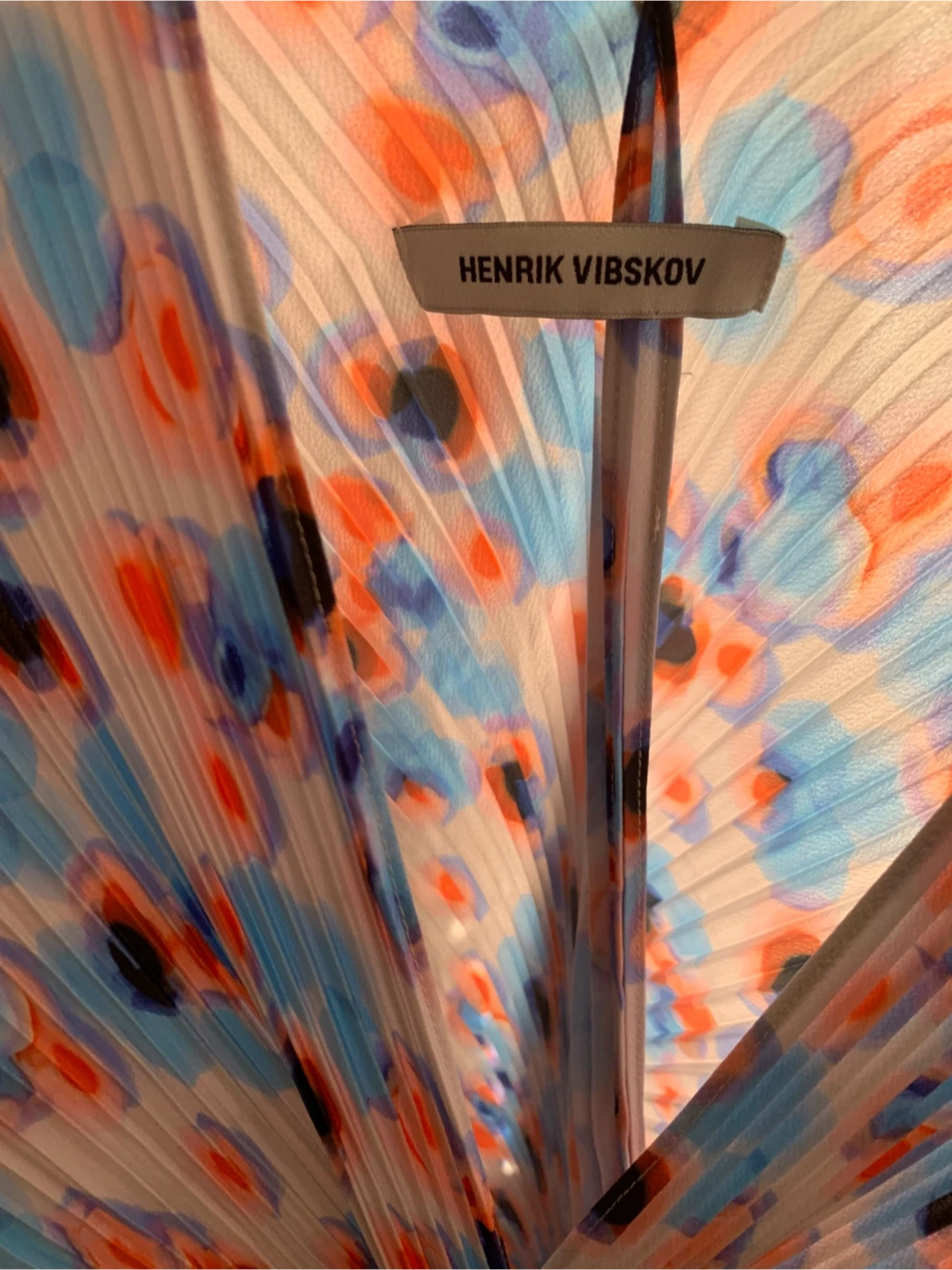 Selling a Henrik Vibskov top with a unique pleated design and a vibrant floral pattern. The colors are a mix of blue, orange, and black on a white background. It's in great condition and ready for a new home!