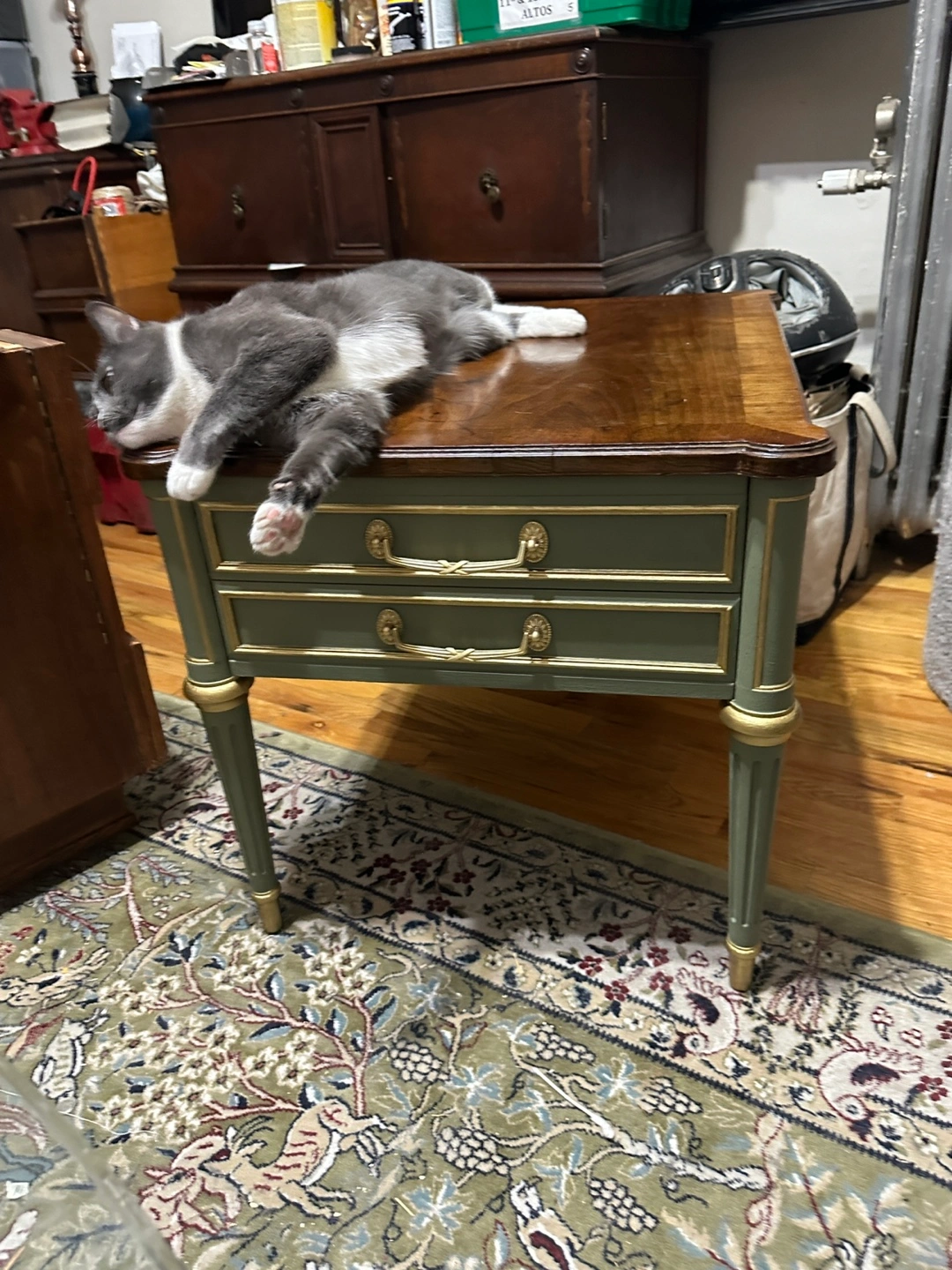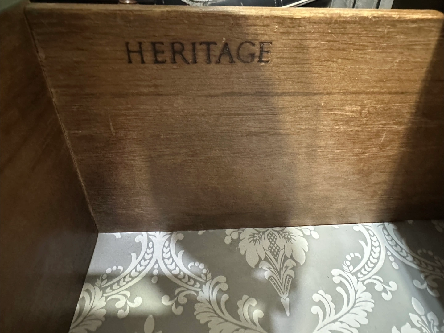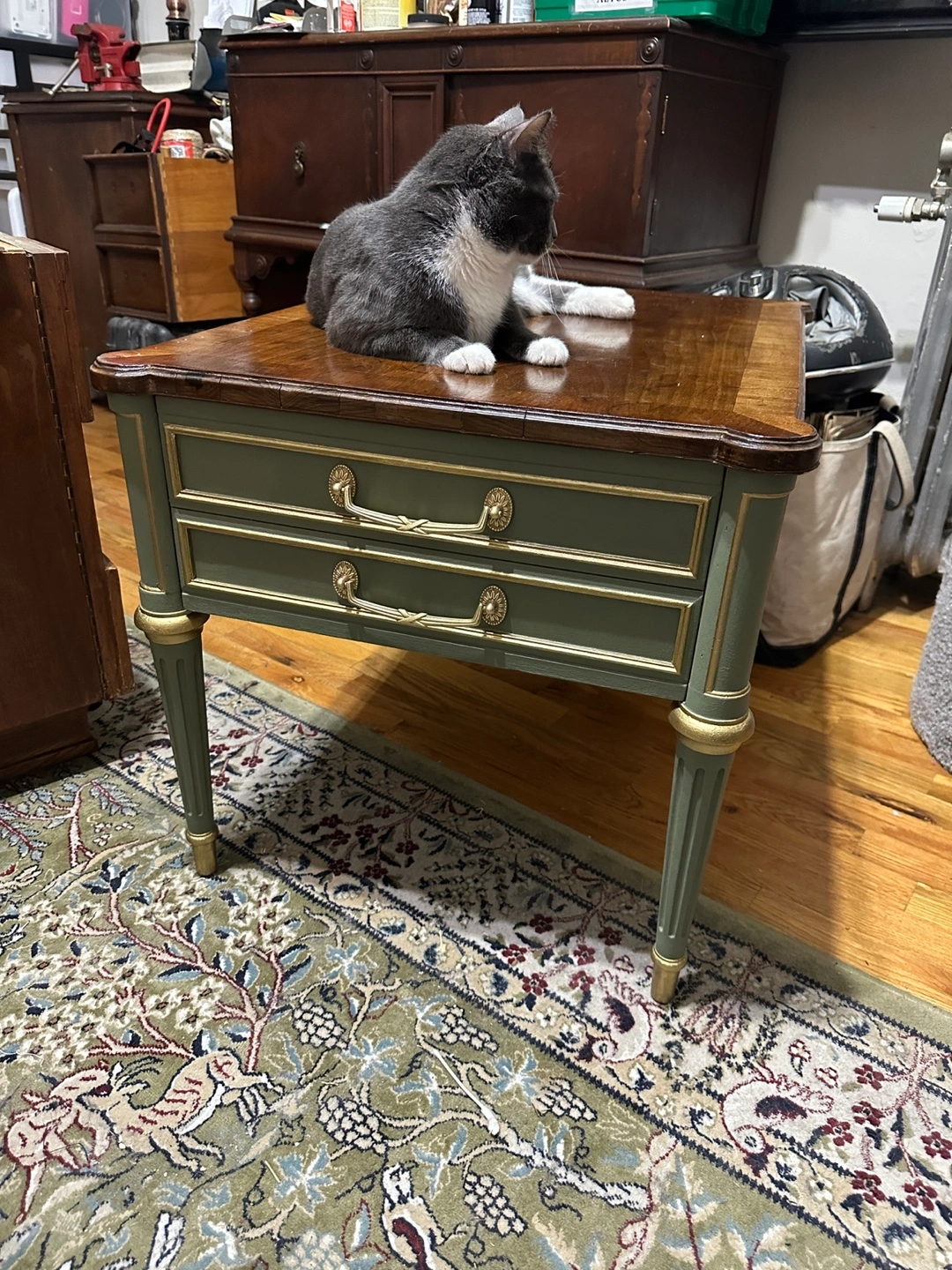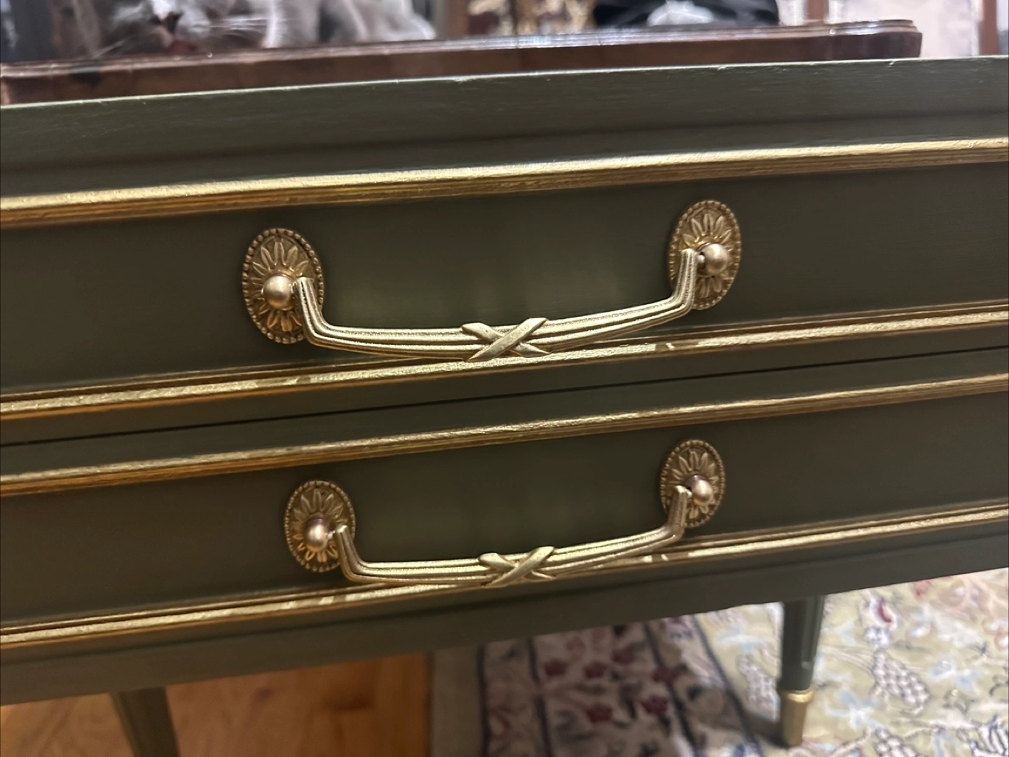 This Classic Heritage End Table is sturdy and solidly constructed. Recently refinished in a mat sage green with gold accents to highlight the beautiful original brass hardware and the classic fluted leg design. The top does have some dark rings left by cups but the gorgeous matchbook rosewood veneer top has been protected with a new shellac French polish to help prevent further marking. It is likely that the rigs could be sanded out and the top refinished but I chose not to do so as I didn’t want to sand through the veneer and did the work in an apartment. The piece has one solidly dovetailed drawer, branded on the inside with the original makers mark, and which has been waxed and lined with a lovely grey damask peel and stick protective liner-paper which is removable if the new owner wishes to change the look. This is a beautiful and functional heirloom piece made by a well known and respected American furniture manufacturer from solid hardwoods that will last for generations if taken care of. A screenshot of a pair of the same end tables in the original finish currently listed on “Cherish” for $1,295 is included in the photo for comparison. 21.5” tall x 28.5”long x22”wide Offers will be considered. $125 or best offer, free local pick up in Brooklyn or delivery in the nyc area available for a $100 fee. All sales final please feel free to ask all questions you may have prior to purchase.