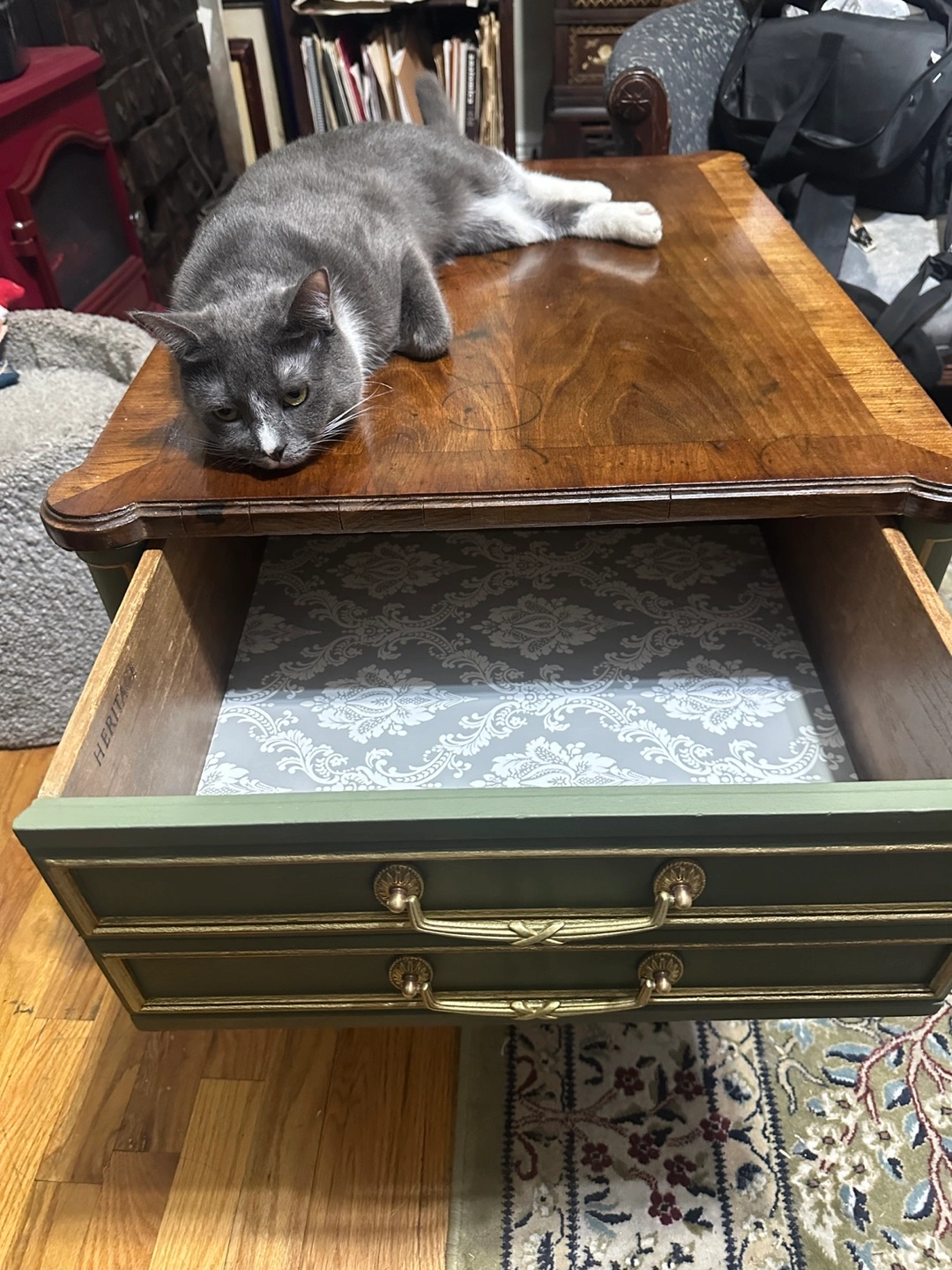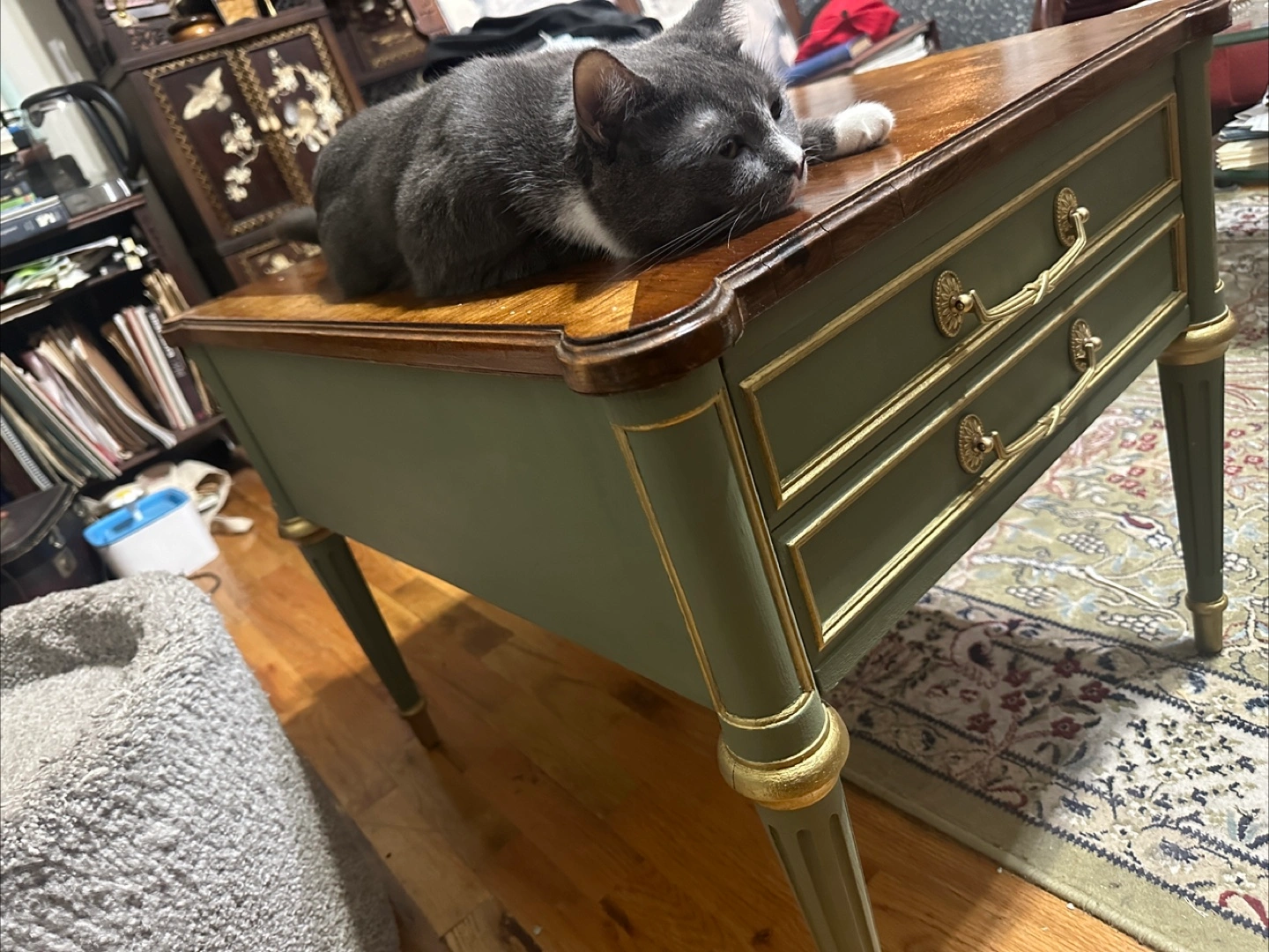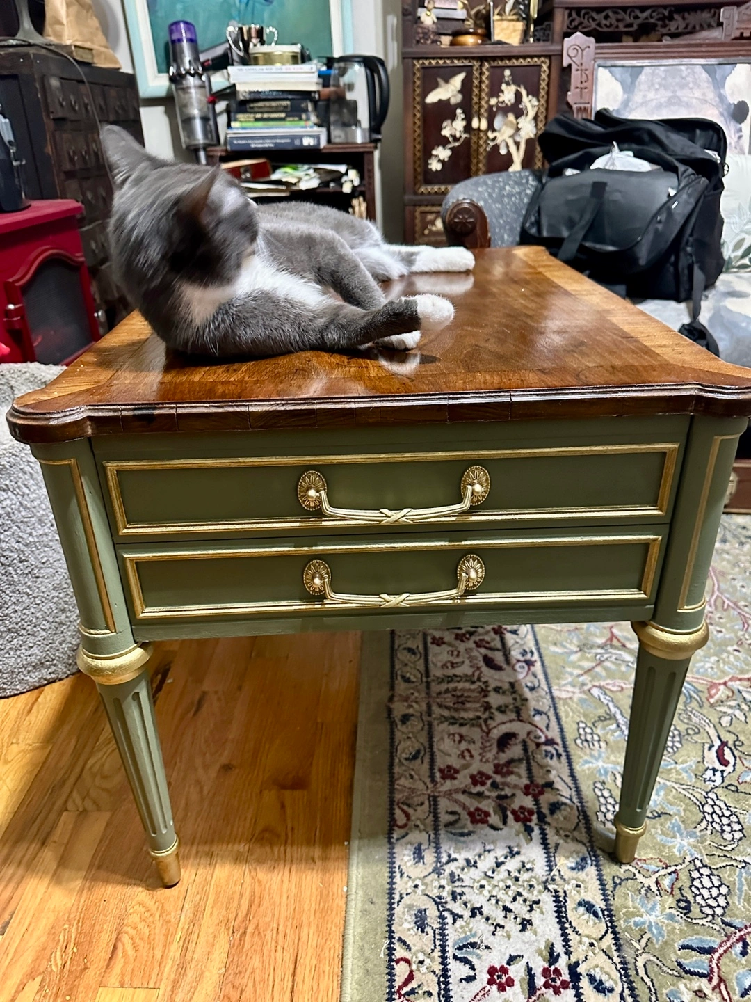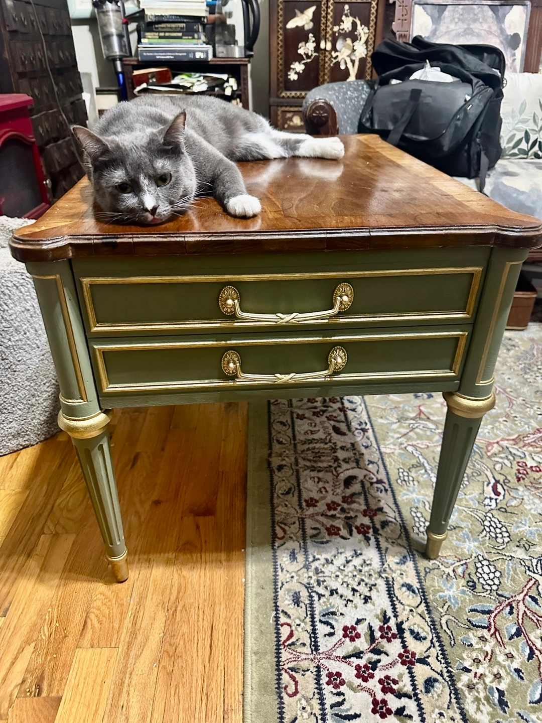 This Classic Heritage End Table is sturdy and solidly constructed. Recently refinished in a mat sage green with gold accents to highlight the beautiful original brass hardware and the classic fluted leg design. The top does have some dark rings left by cups but the gorgeous matchbook rosewood veneer top has been protected with a new shellac French polish to help prevent further marking. It is likely that the rigs could be sanded out and the top refinished but I chose not to do so as I didn’t want to sand through the veneer and did the work in an apartment. The piece has one solidly dovetailed drawer, branded on the inside with the original makers mark, and which has been waxed and lined with a lovely grey damask peel and stick protective liner-paper which is removable if the new owner wishes to change the look. This is a beautiful and functional heirloom piece made by a well known and respected American furniture manufacturer from solid hardwoods that will last for generations if taken care of. A screenshot of a pair of the same end tables in the original finish currently listed on “Cherish” for $1,295 is included in the photo for comparison. 21.5” tall x 28.5”long x22”wide Offers will be considered. $125 or best offer, free local pick up in Brooklyn or delivery in the nyc area available for a $100 fee. All sales final please feel free to ask all questions you may have prior to purchase.