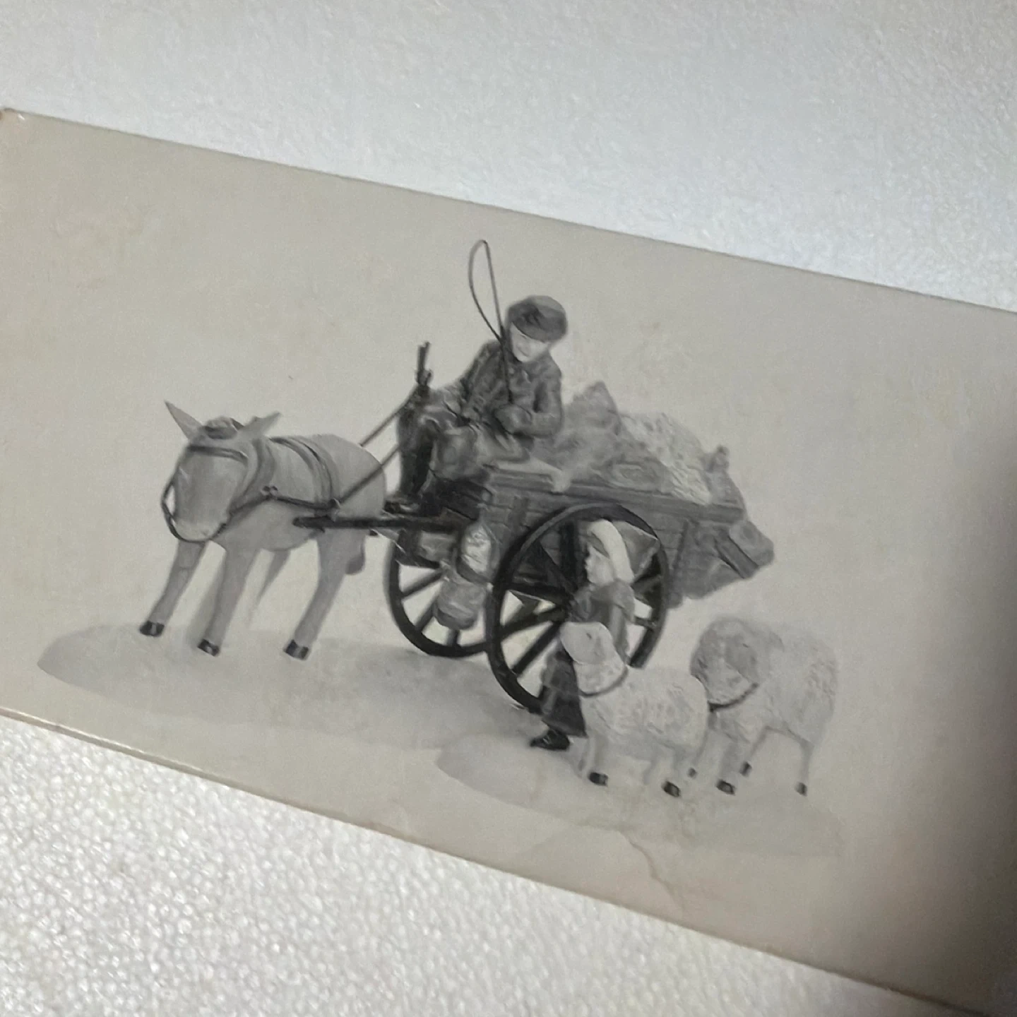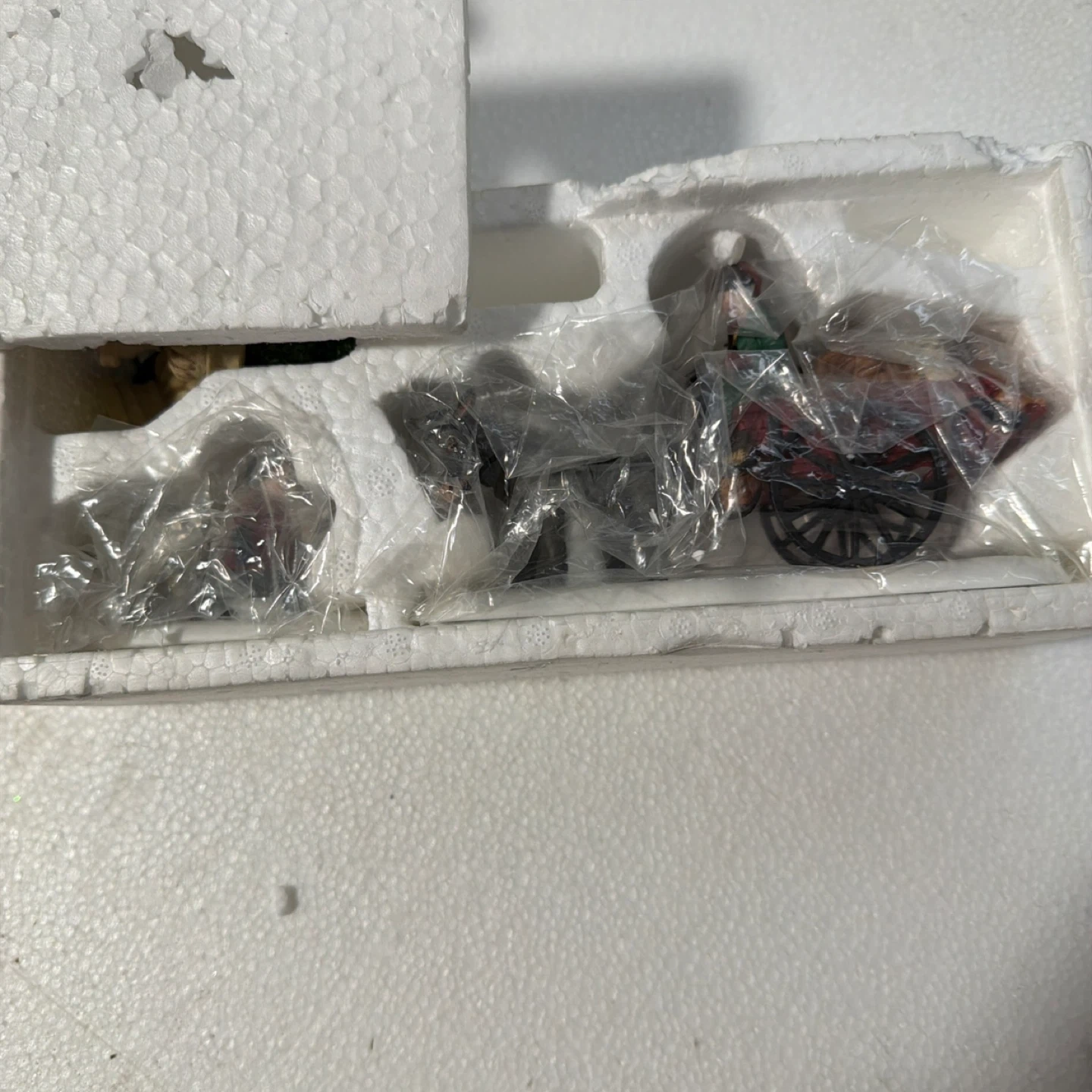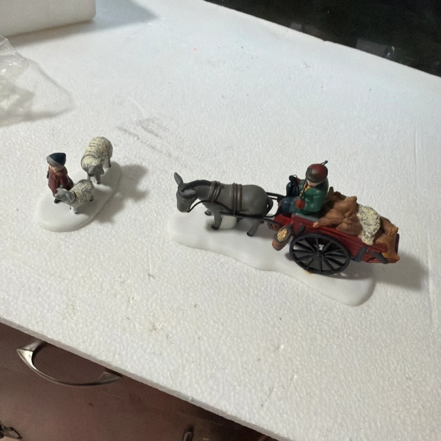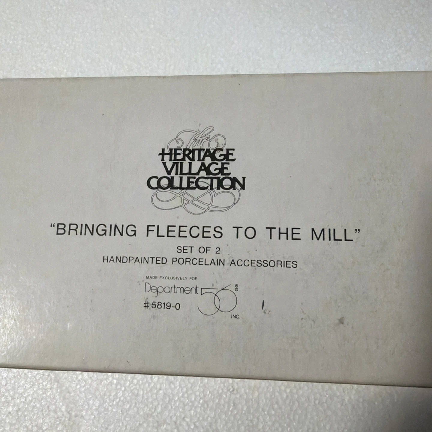 149I'm selling a Heritage Village Collection set titled "Bringing Fleeces to the Mill"! It's a set of 2 handpainted porcelain accessories. The set includes a man with a donkey cart and two sheep with a shepherd. It comes in the original box