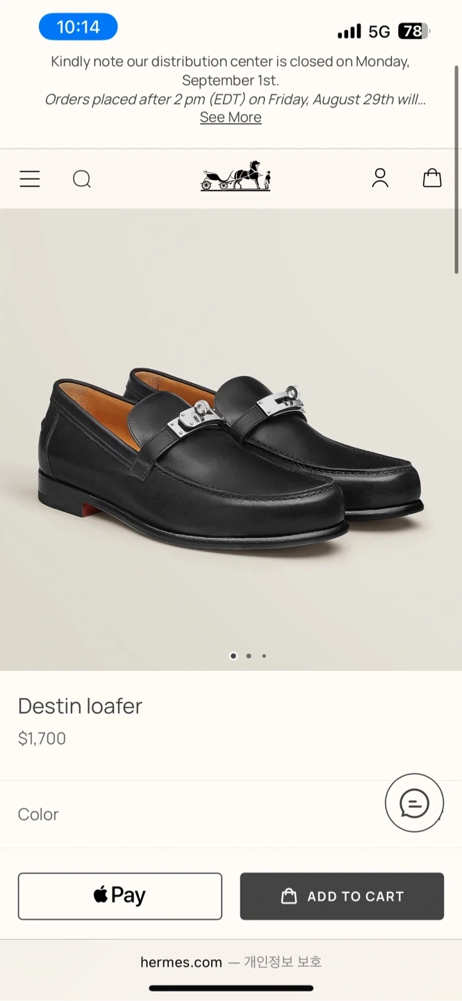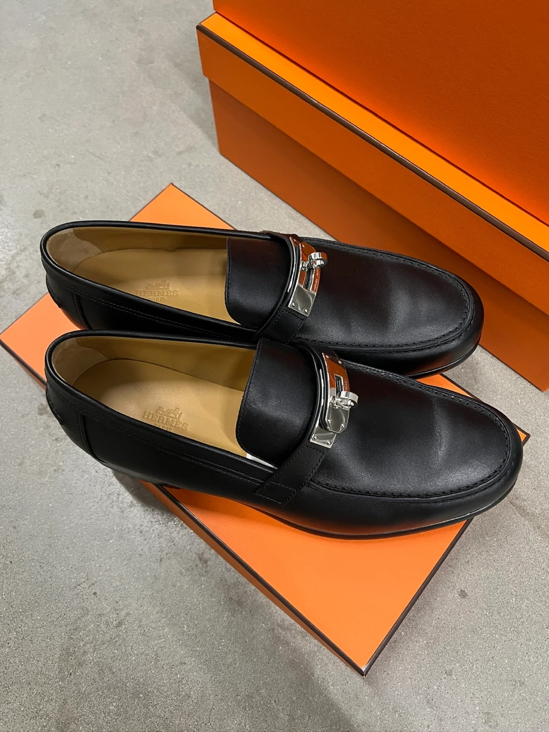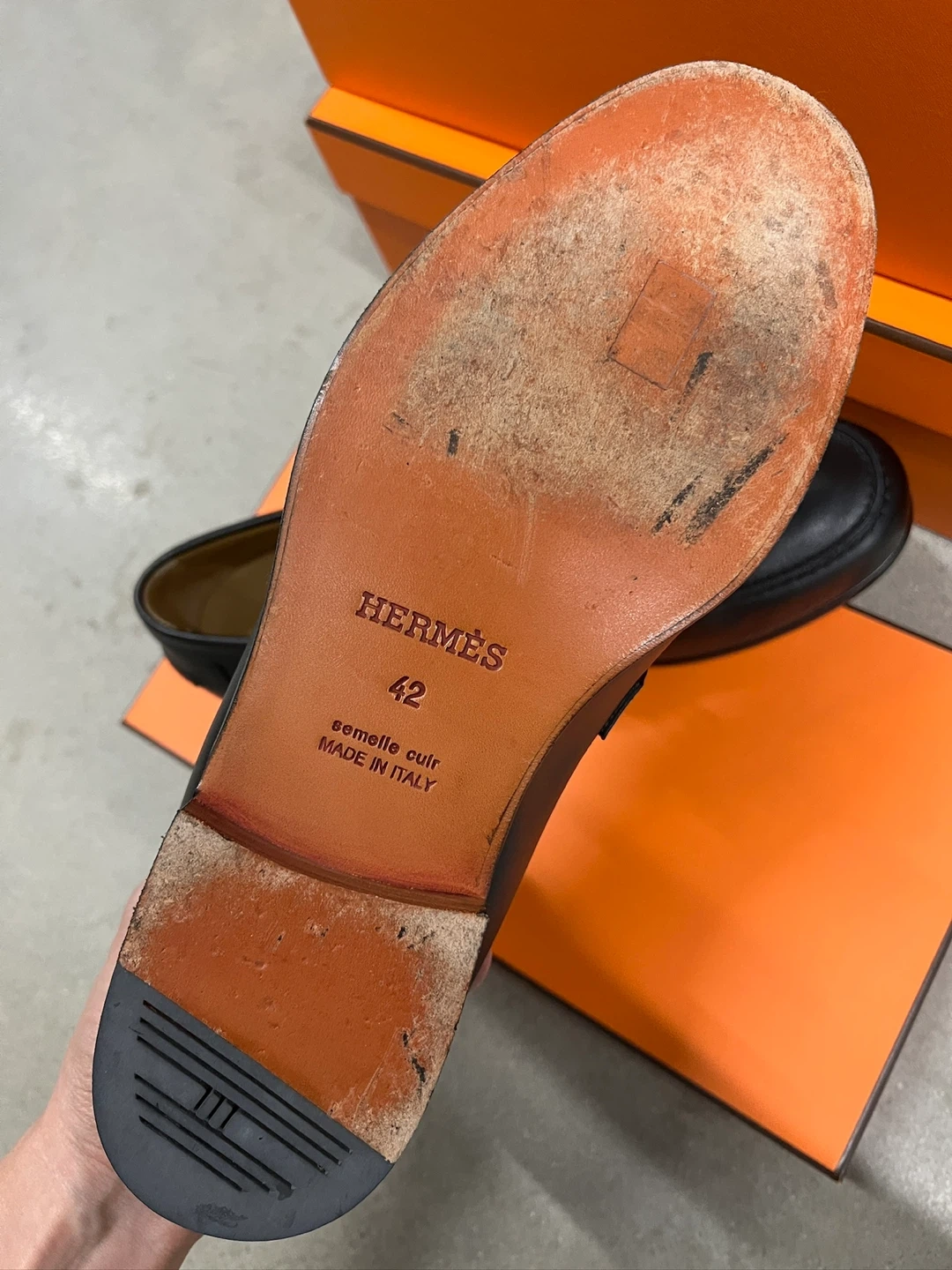 Selling a pair of Hermès black leather loafers in size 42. They are in good condition and come with the original box and dust bags. The soles show some signs of wear, but the uppers are in great shape. These are a classic and stylish addition to any wardrobe!