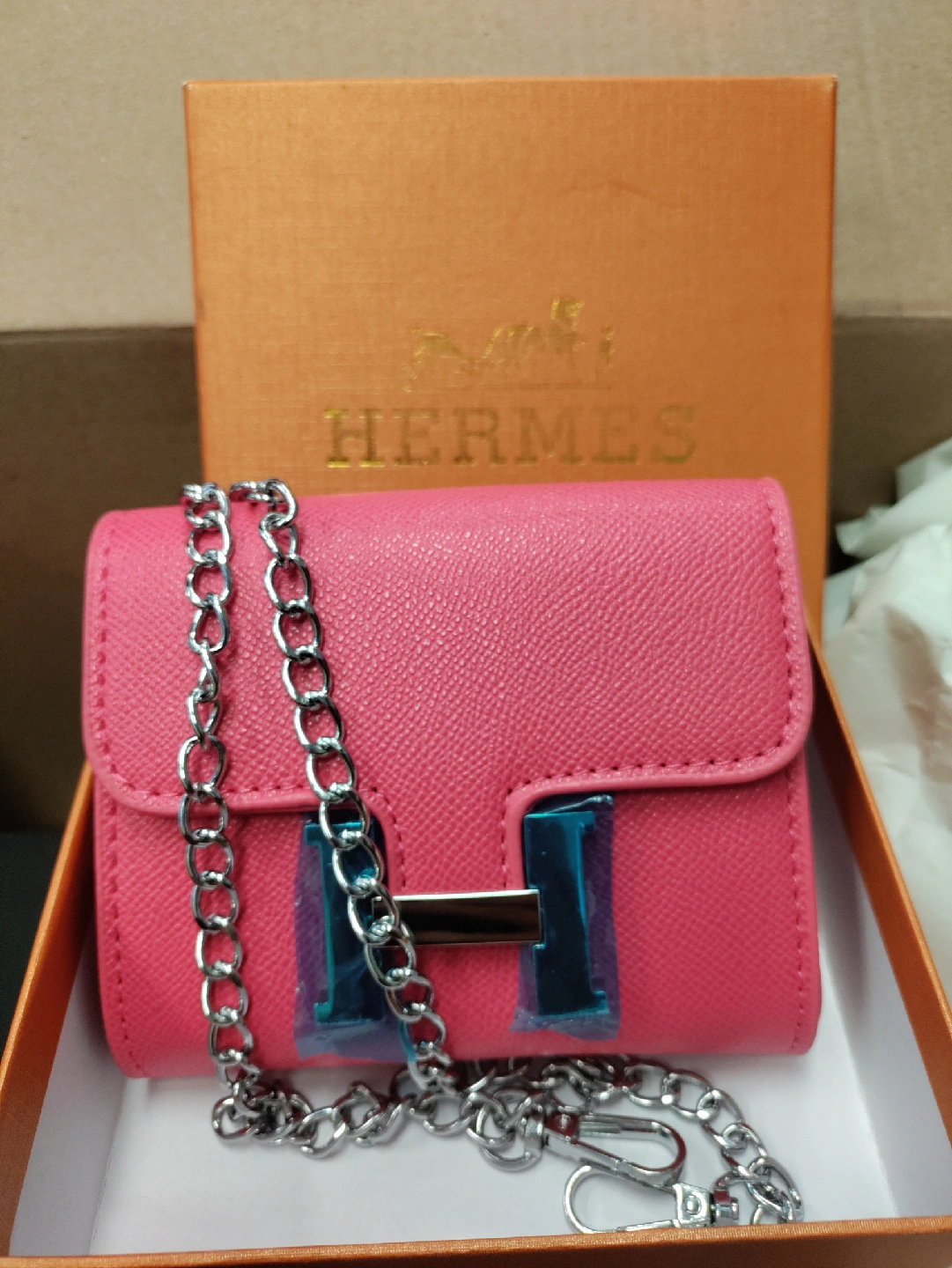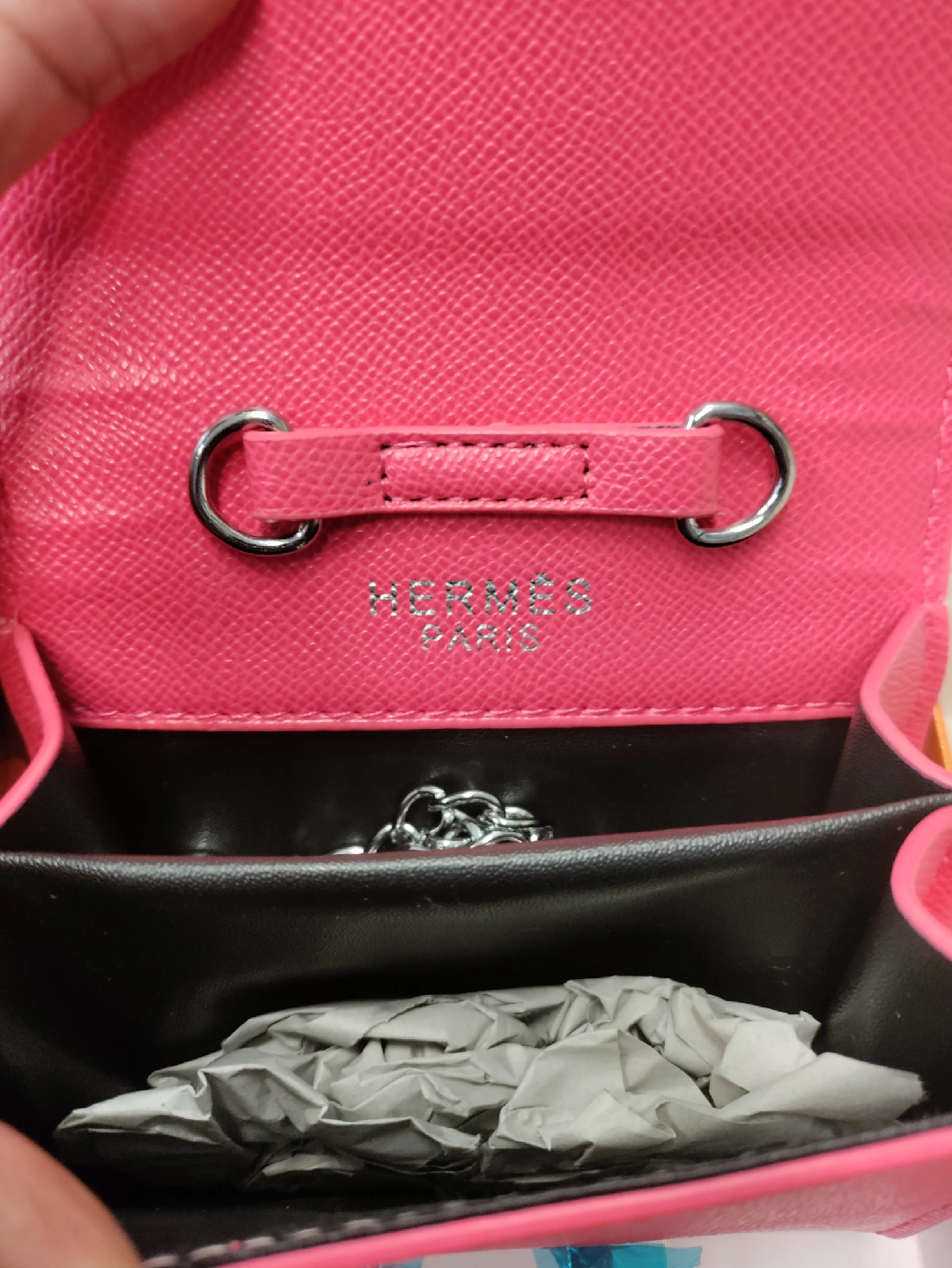 This is a Hermès Micro Della Cavalleria chain bag in pink. It comes with its original box.