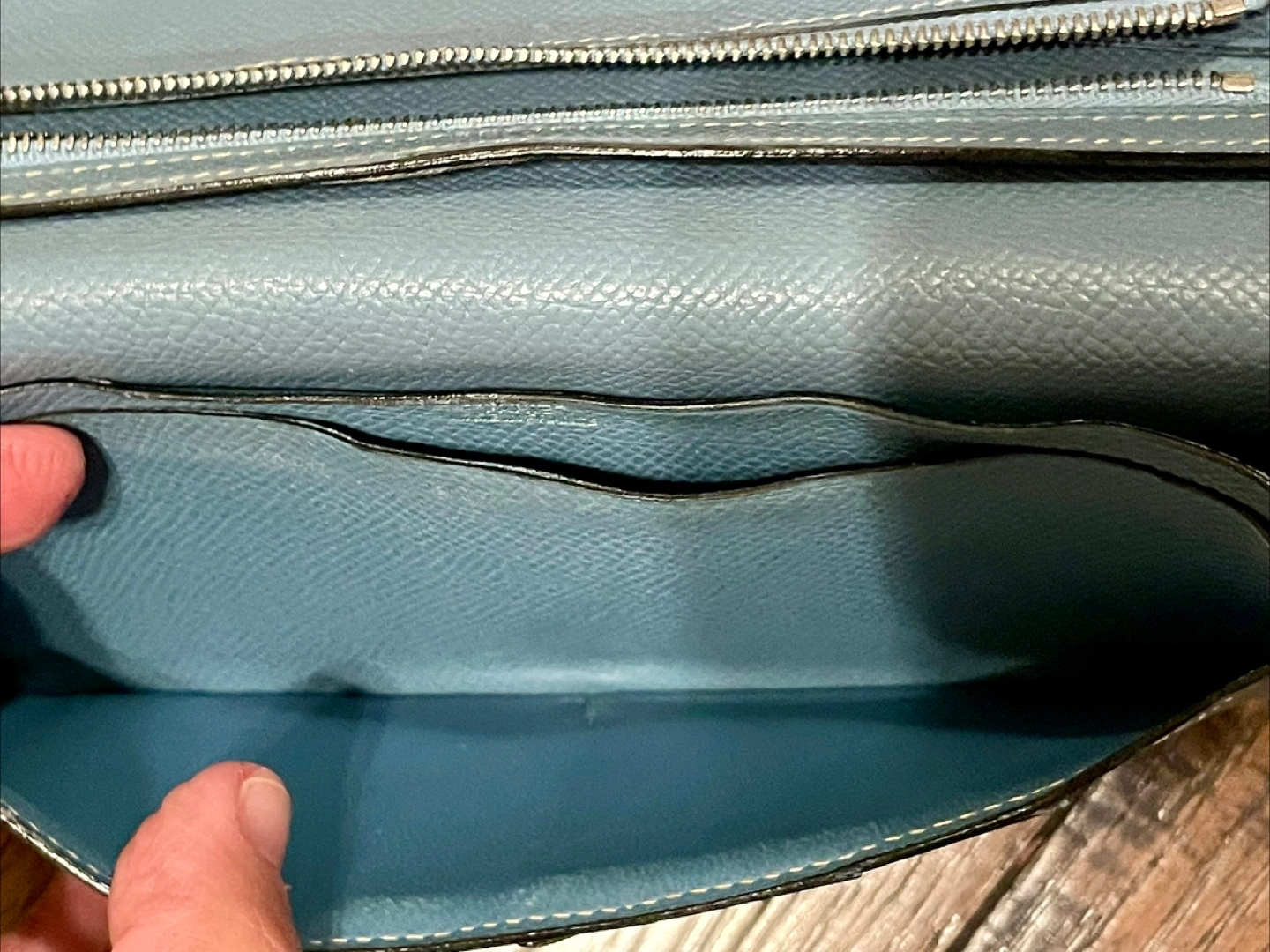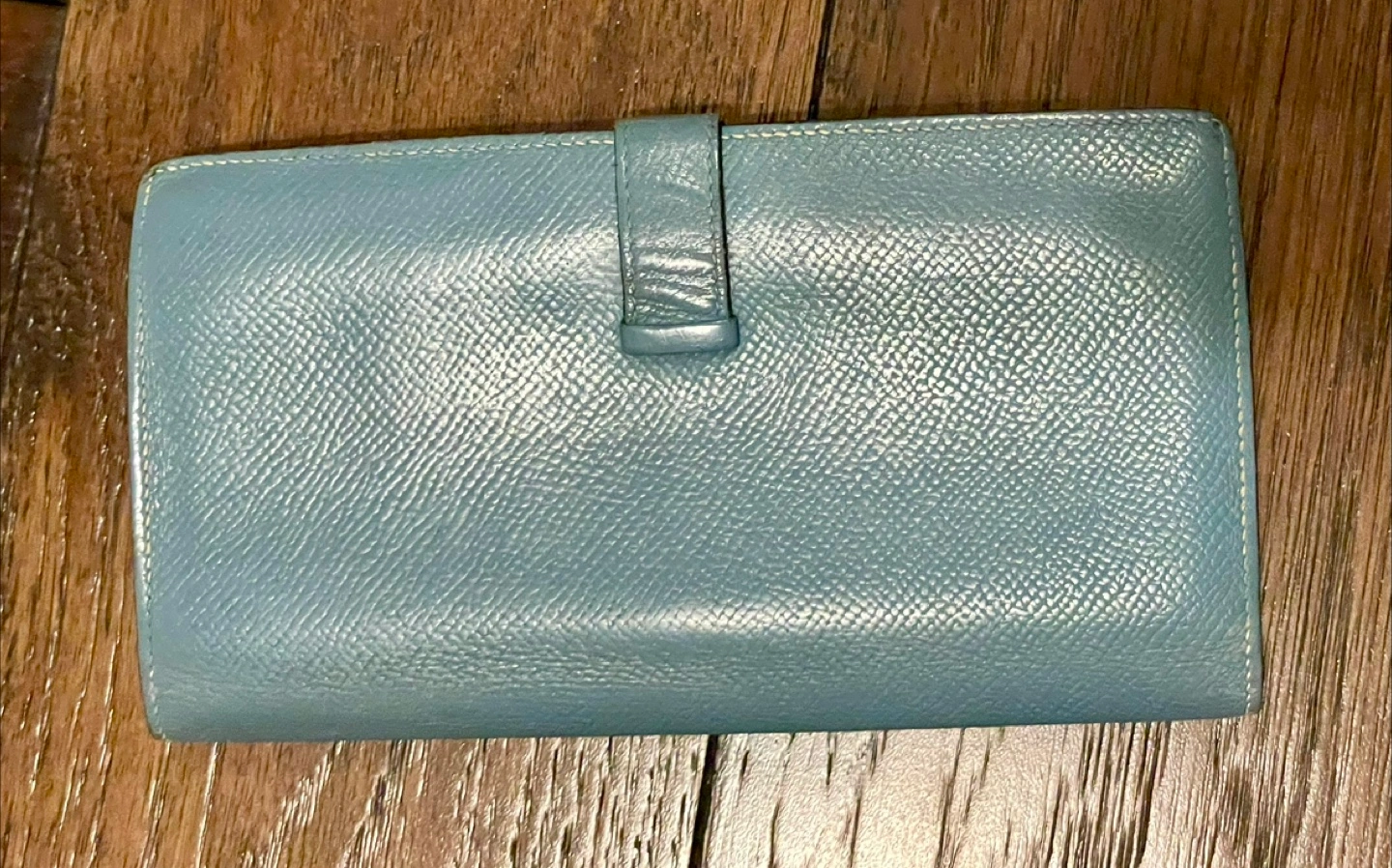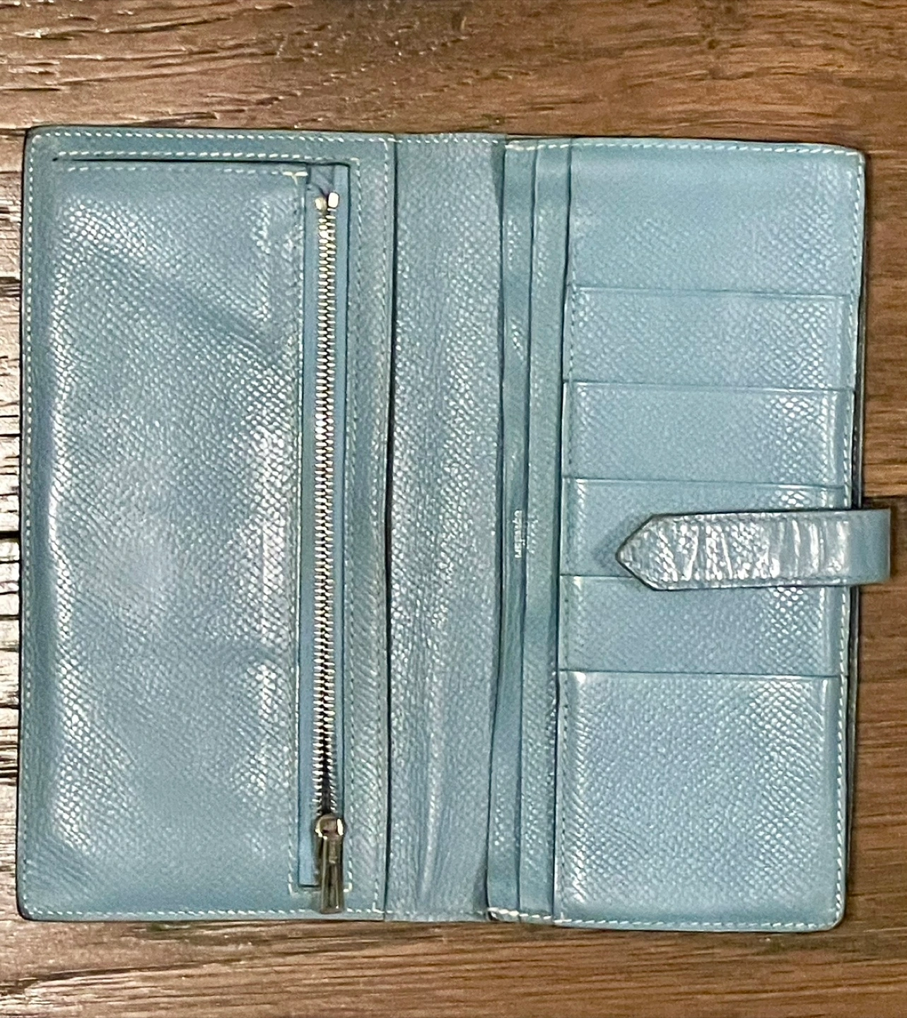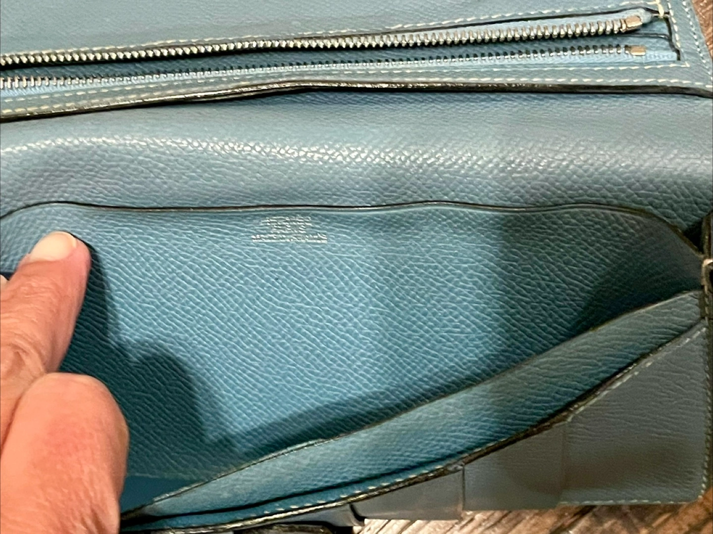 Selling a blue Hermès Paris leather wallet. It has some signs of wear, but is still in good condition and has lots of life left. A classic piece!
