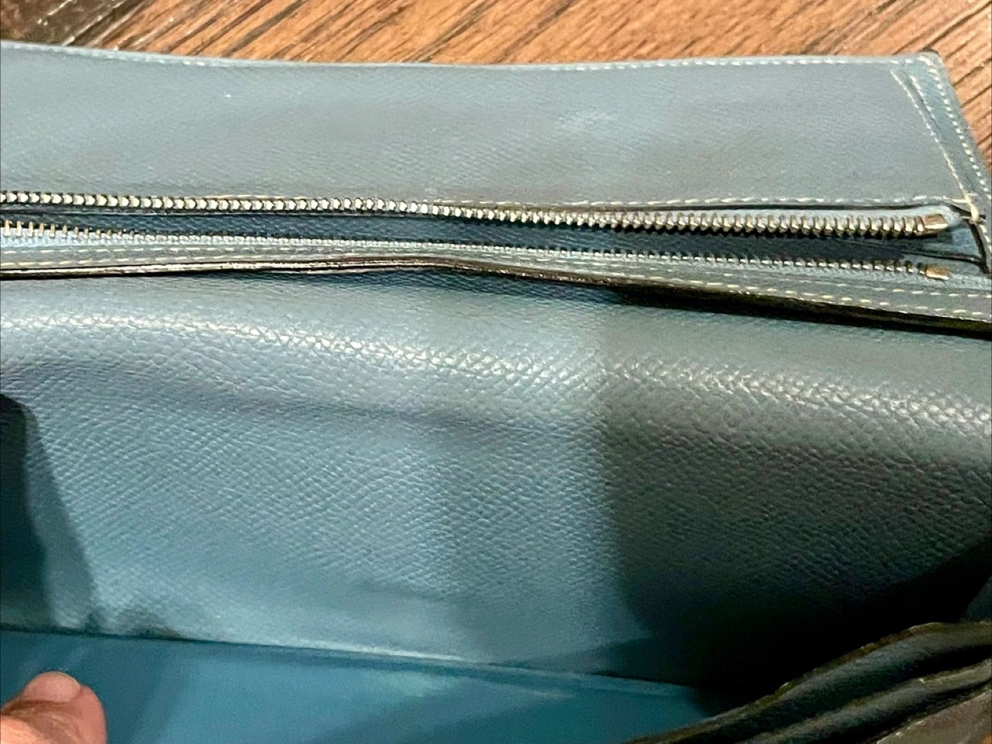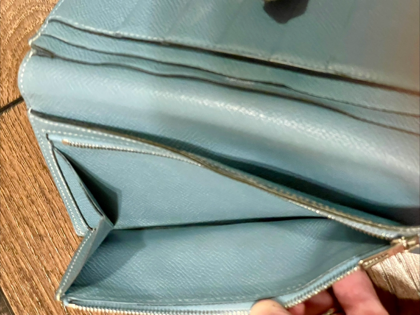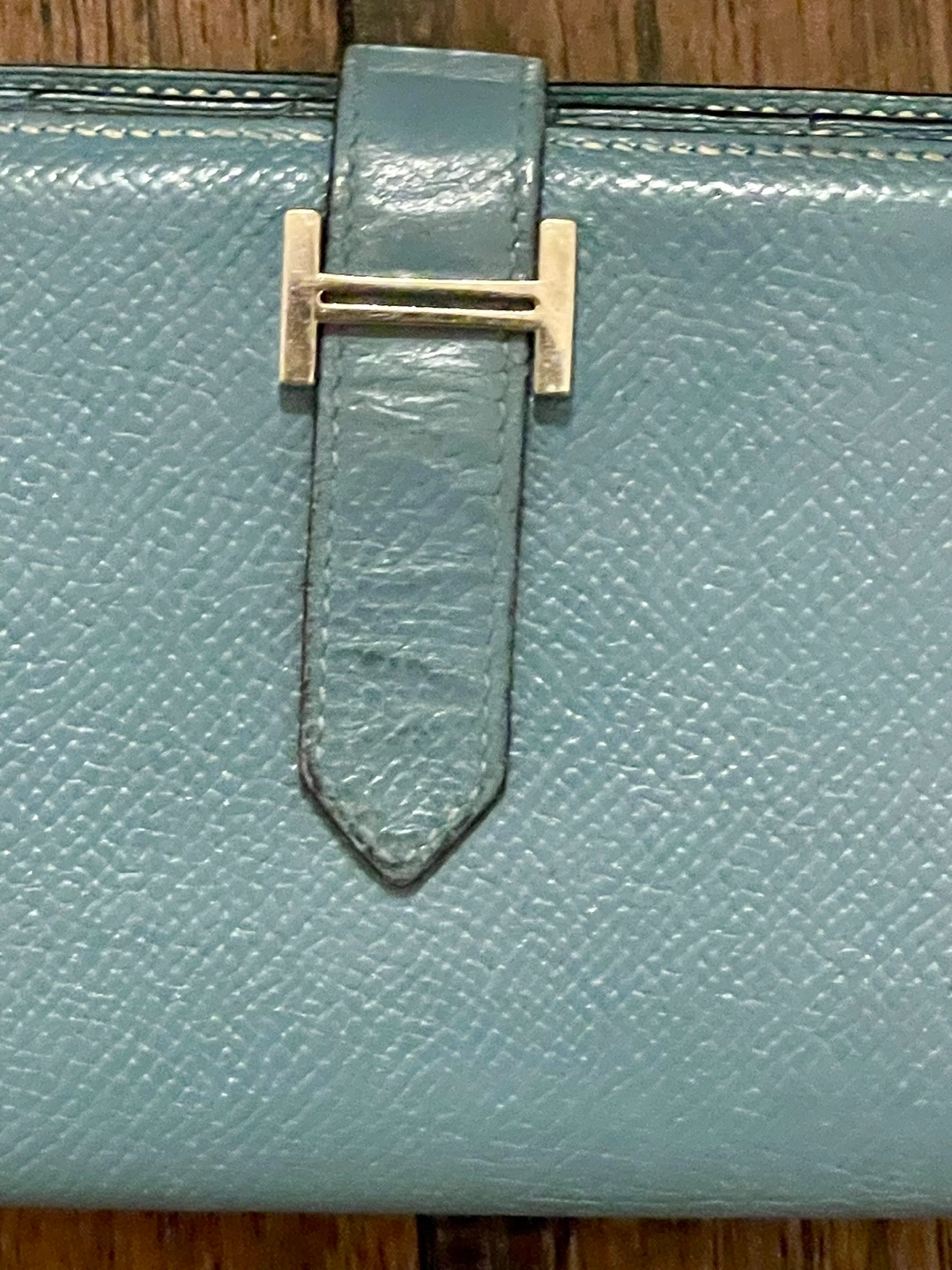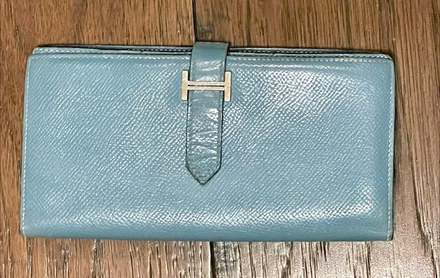 Selling a blue Hermès Paris leather wallet. It has some signs of wear, but is still in good condition and has lots of life left. A classic piece!