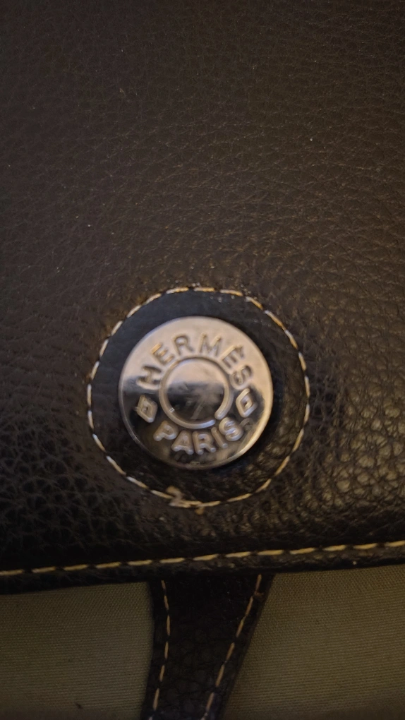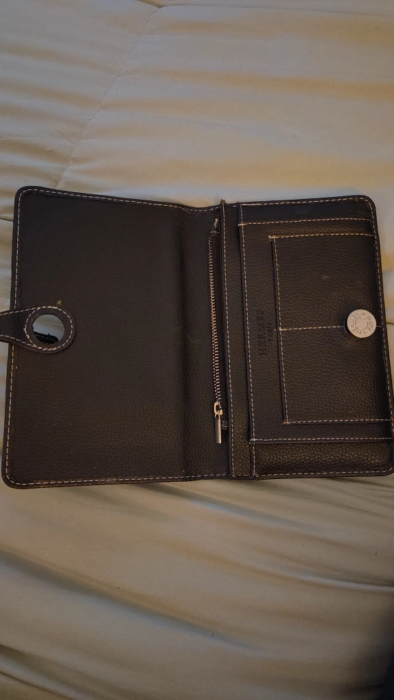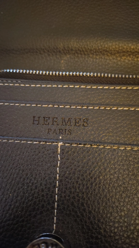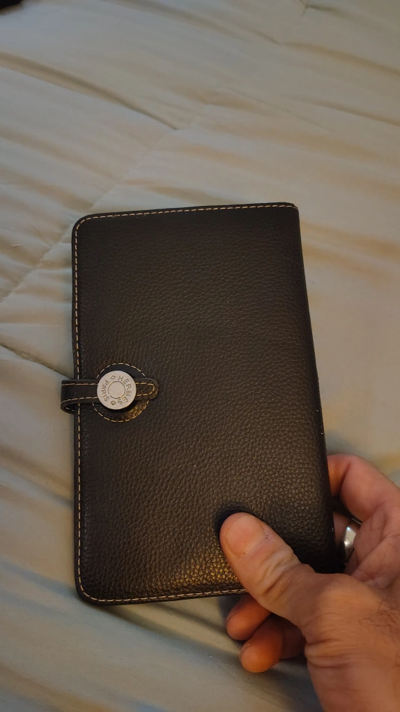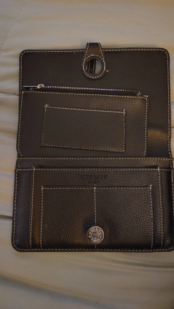 221Selling a black leather wallet from Hermes Paris. It has a button closure and a zippered compartment inside. It's in great condition and ready for a new home!