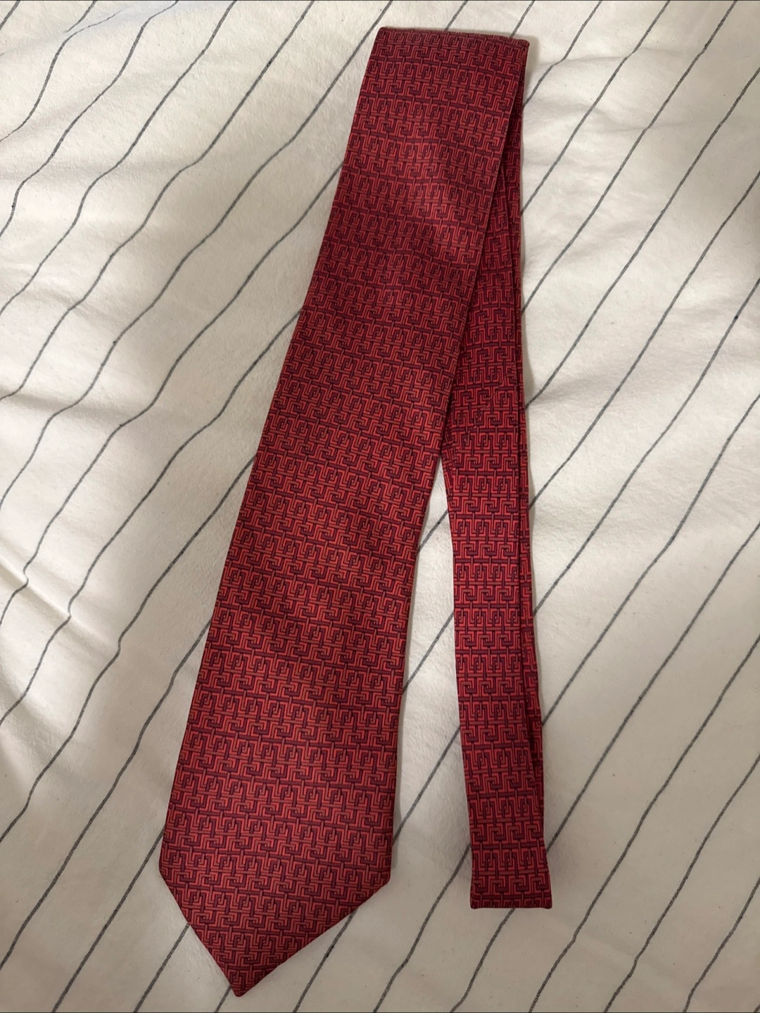 A beautiful, detailed red silk tie. A patterned design throughout. The back of the tie has a label. Wear this tie knowing you will look good.