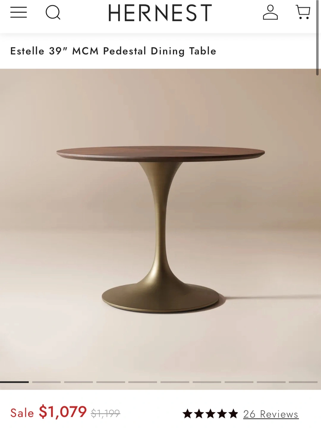 Selling a HERNEST Estelle 39" MCM Pedestal Dining Table. It has a beautiful mid-century modern design. The table features a walnut-finished top and a pedestal base. Originally listed for $1,199, it's now on sale for $1,079. Brand new in box. My loss ur gain