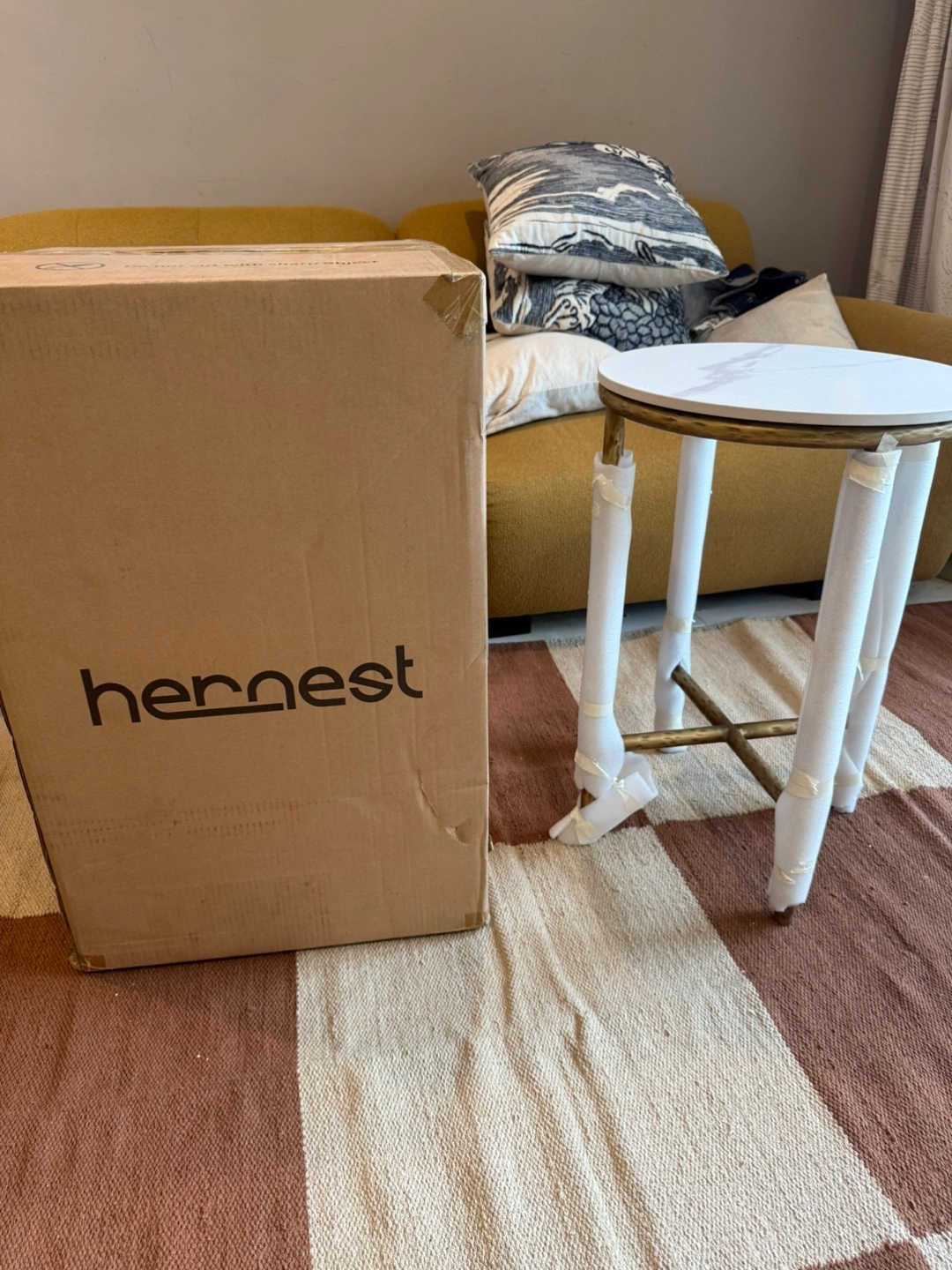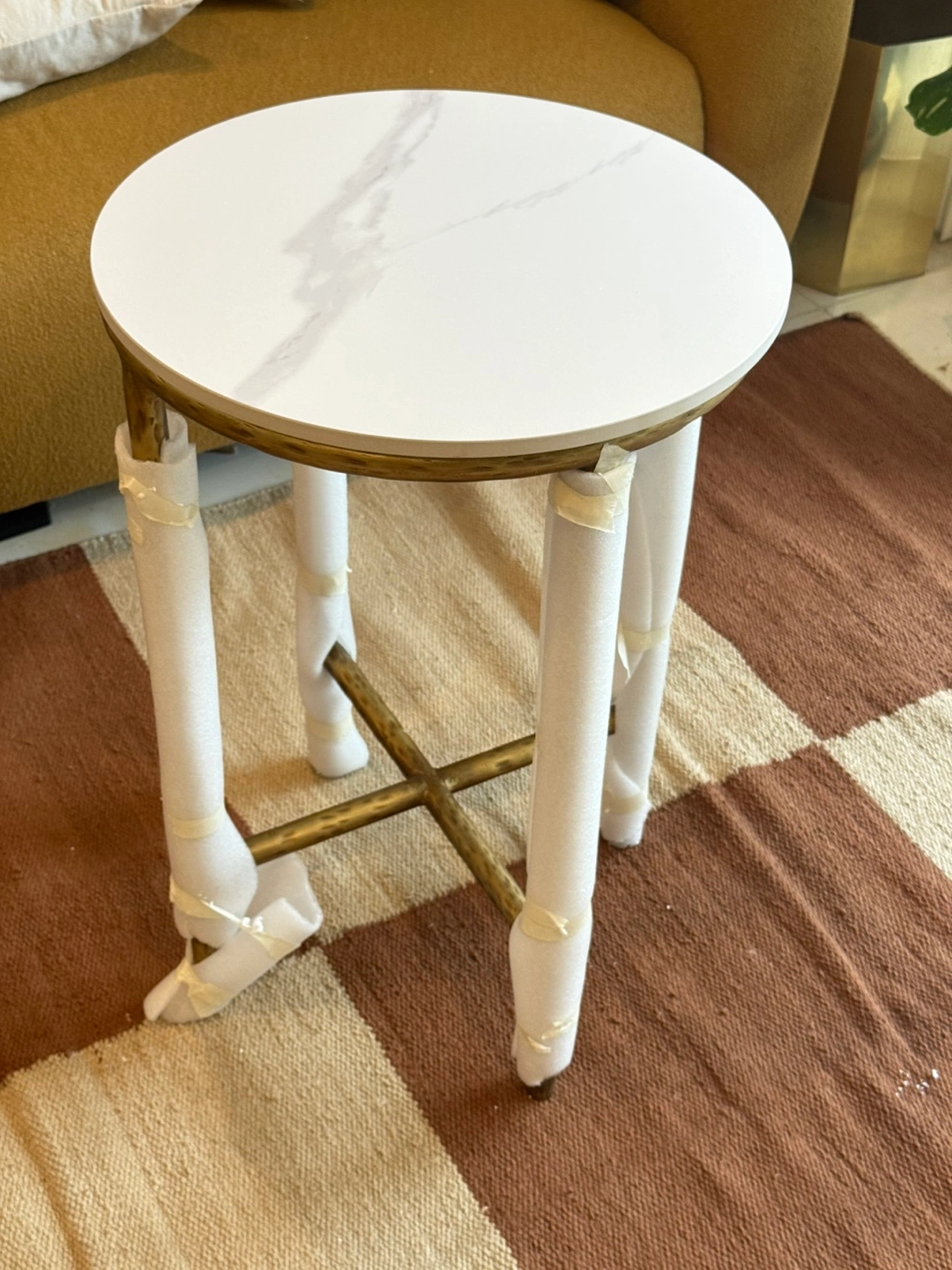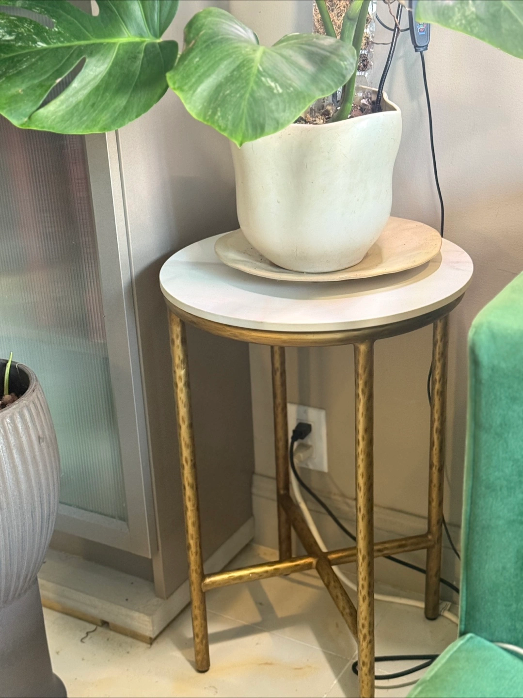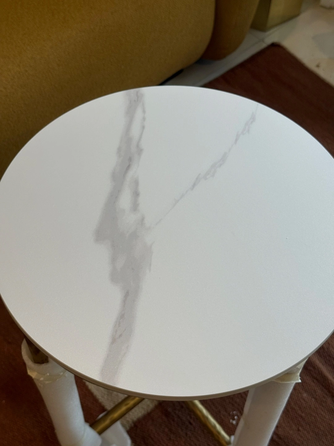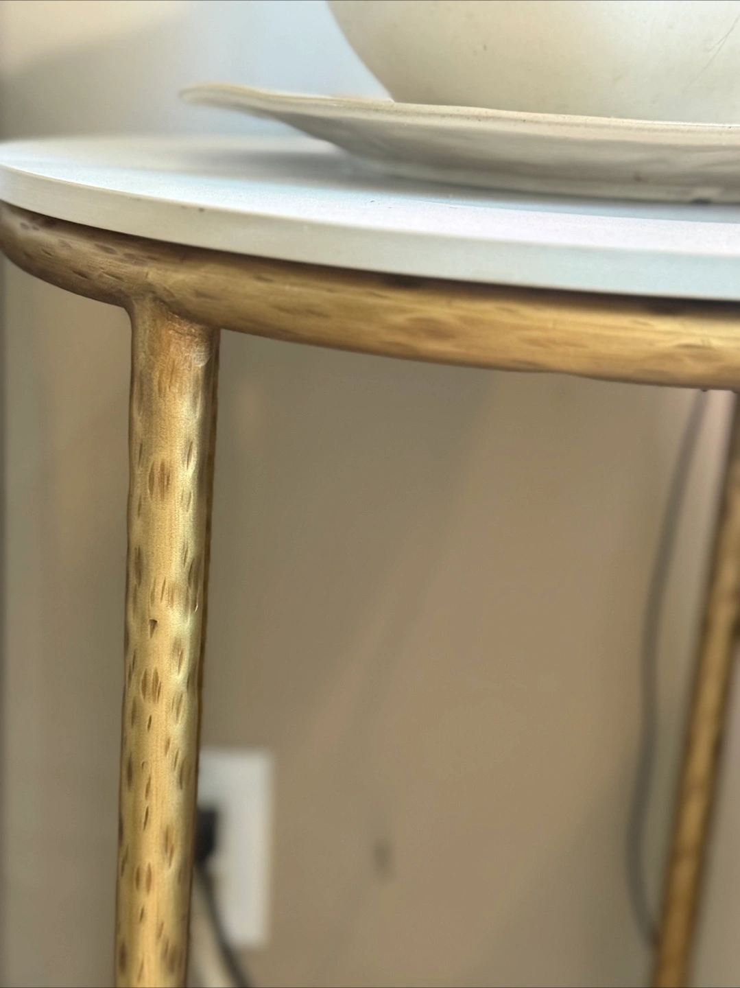 117Hernest side table, sintered stone top (with marble print) and brushed and hammered brass legs. *BRAND NEW additional one still in package*, Size: 15.7” dia x 23.6” tall. Have 2 of them, $55 each or $90 for both. Additional one brand new with package. Pick up from queens Elmhurst